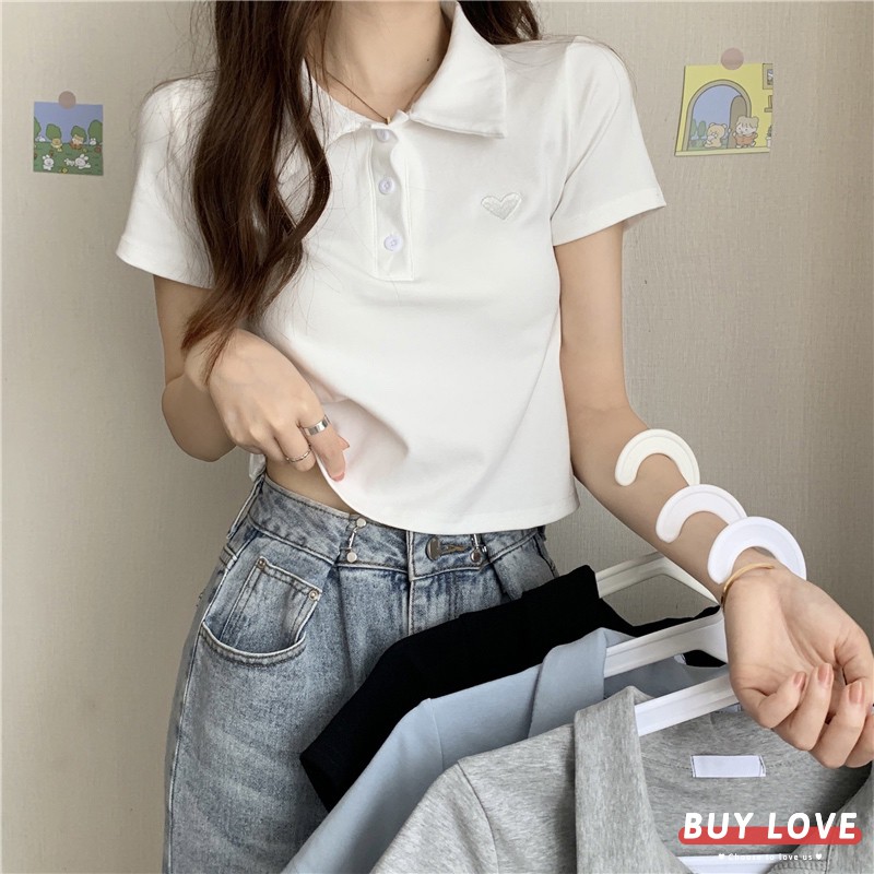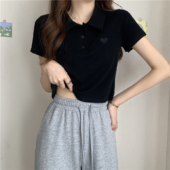 【買到戀愛】現貨出清 刺繡愛心短版POLO短袖棉T T恤【FA4777】