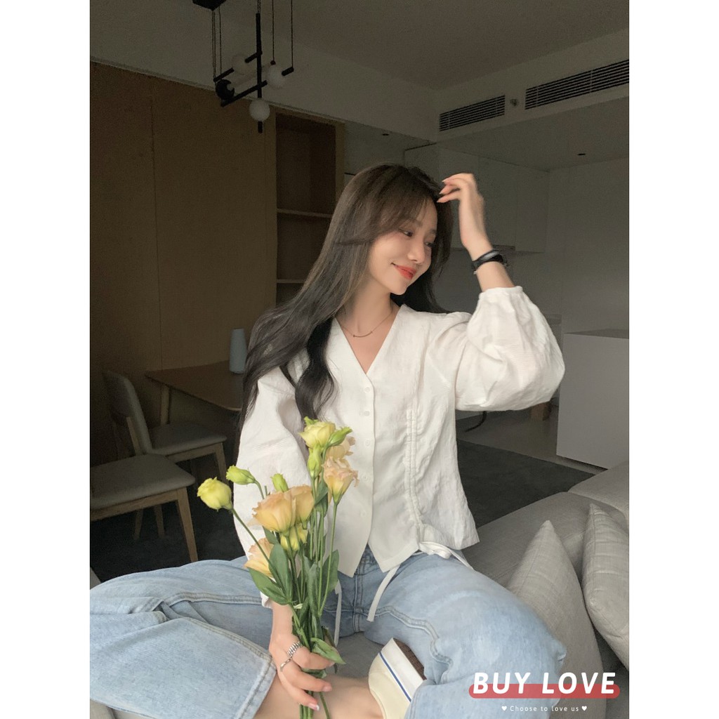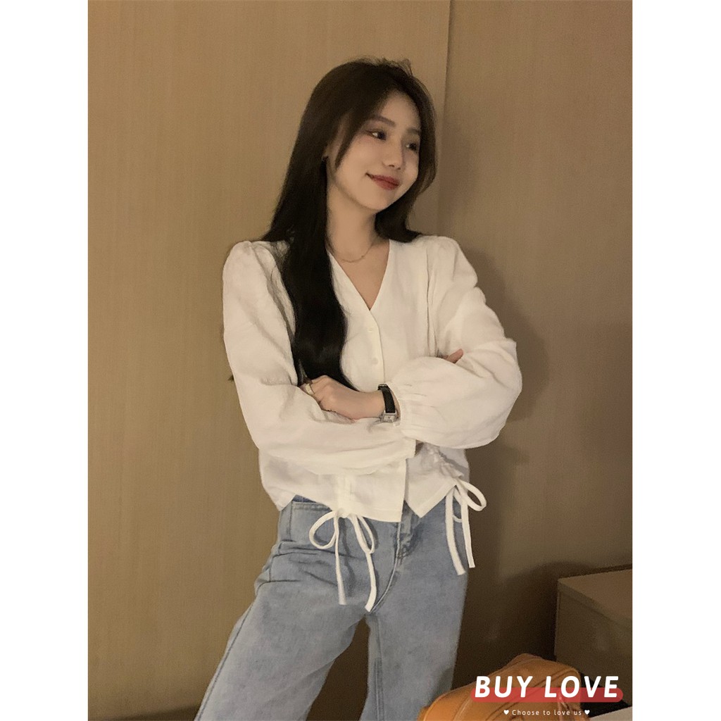 【買到戀愛】現貨出清 浪漫系V領抽繩素面白襯衫 長袖 甜美 秋裝 上衣 氣質 【FB3377】