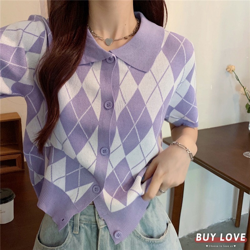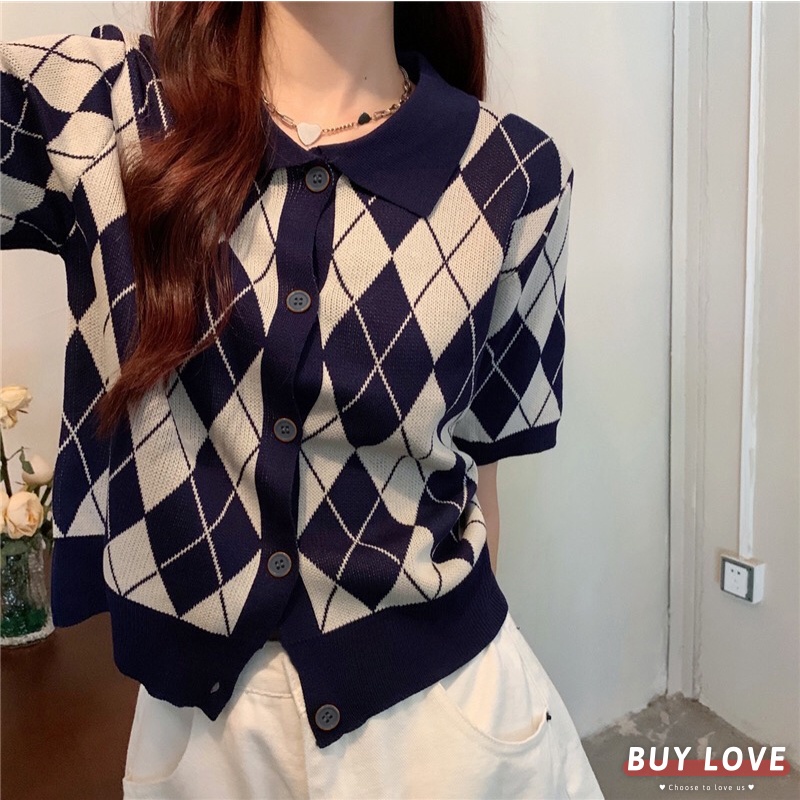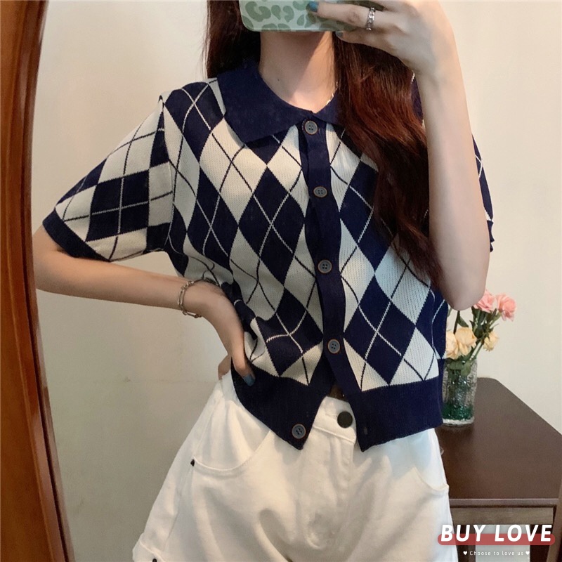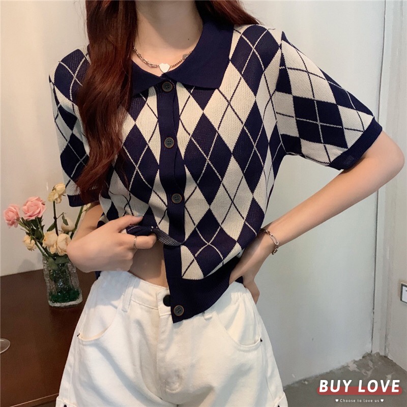 【買到戀愛】隔日到貨 女裝 Y2K 純欲風 復古翻領黑白菱格紋短版排釦針織上衣 POLO衫 短版上衣【FA382】