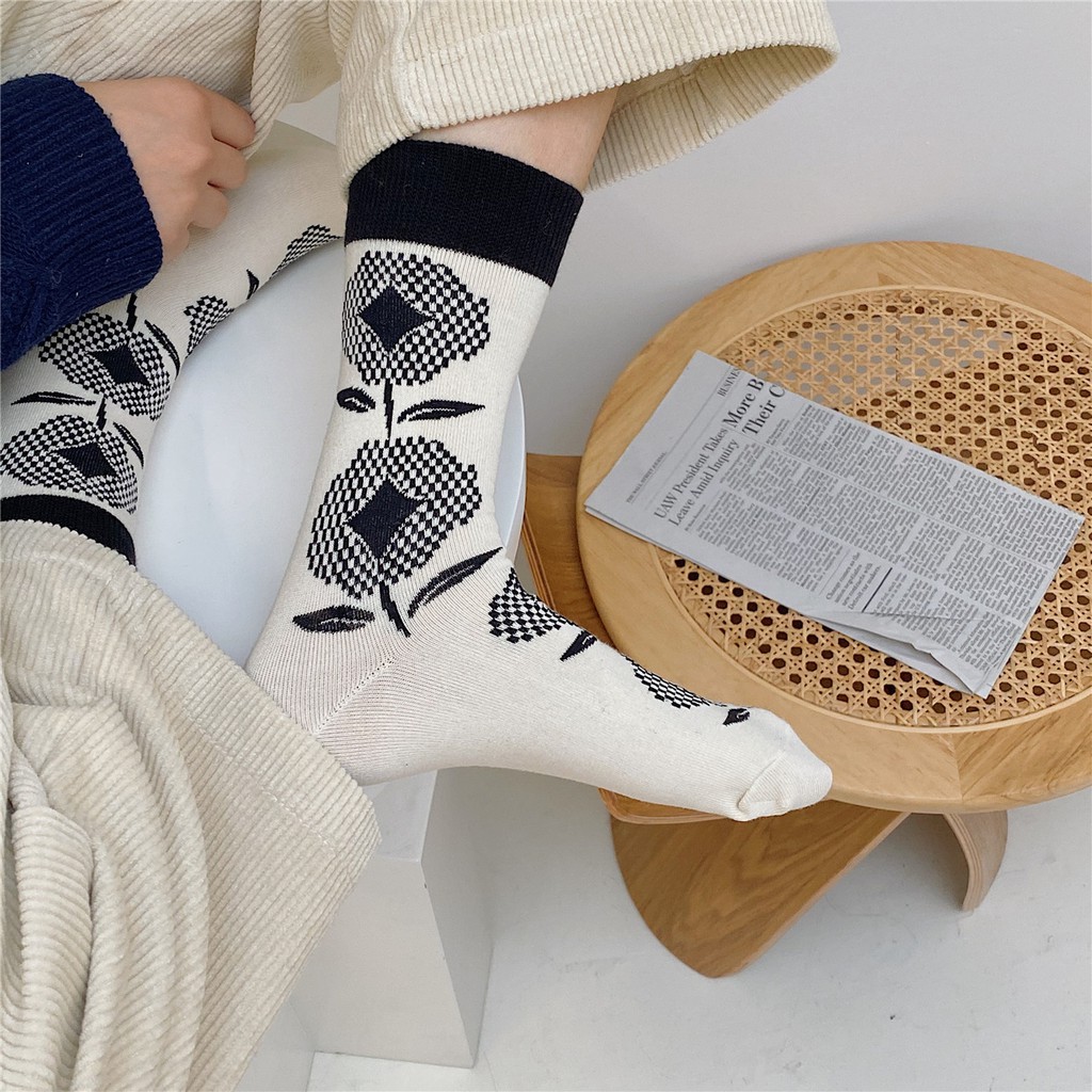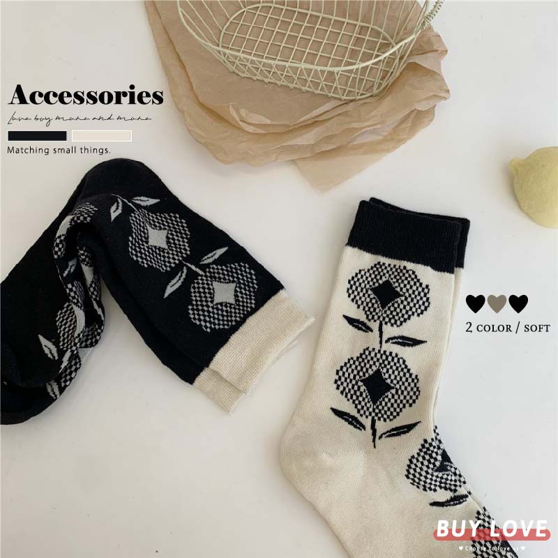 【買到戀愛】現貨出清日系文青款大花朵中筒襪 襪子 女裝 流行 短襪 長襪 絲襪 配件 黑白配 【W2066】