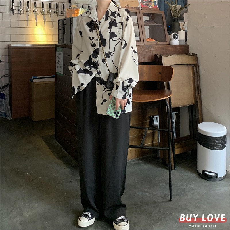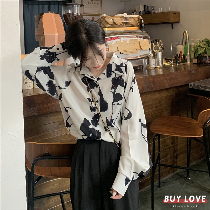 【買到戀愛】現貨出清 復古雪紡黑白線條花襯衫 長袖上衣 秋裝 斑駁 緞面 【FB99】
