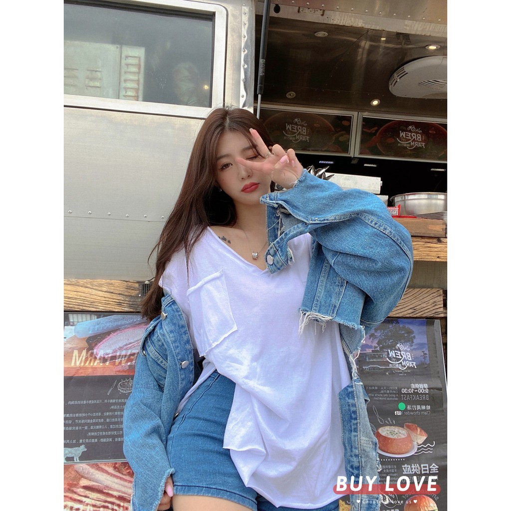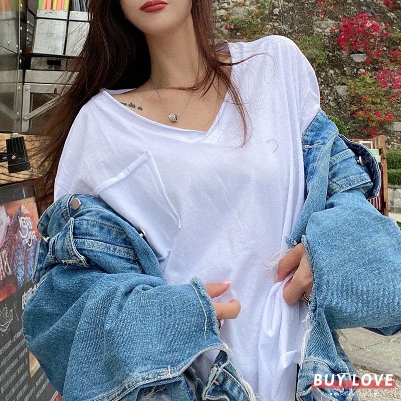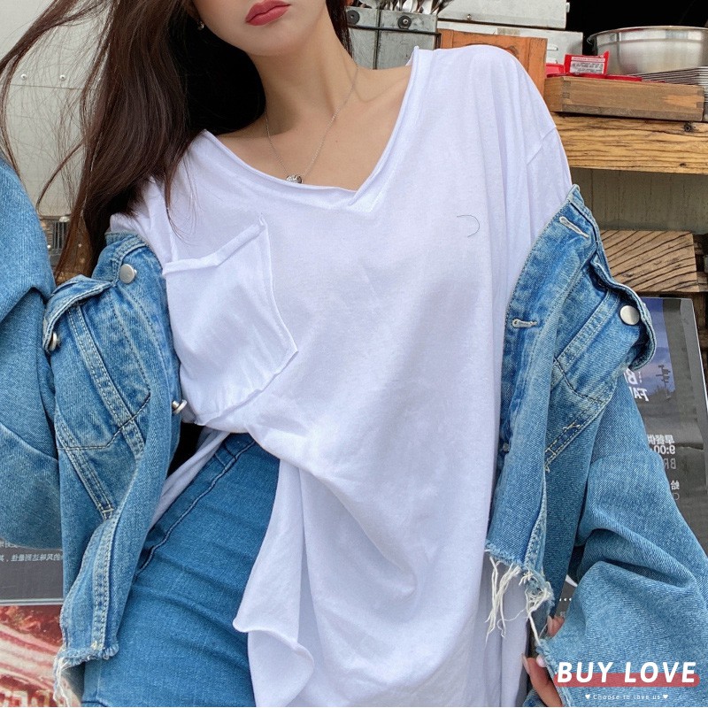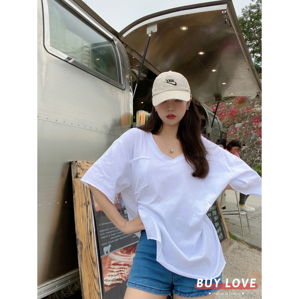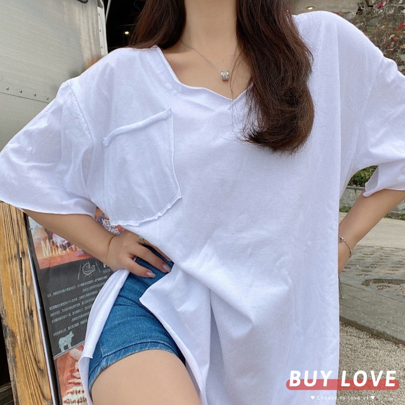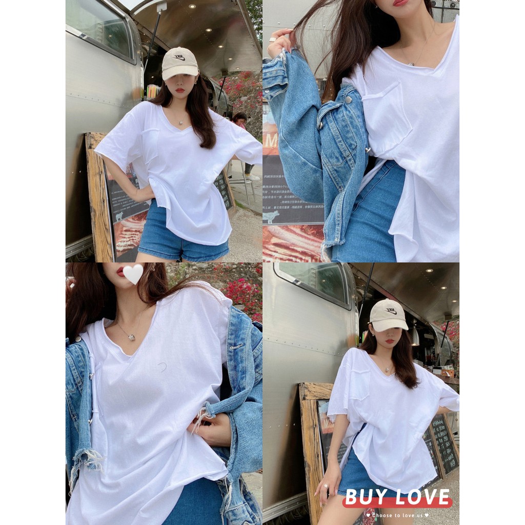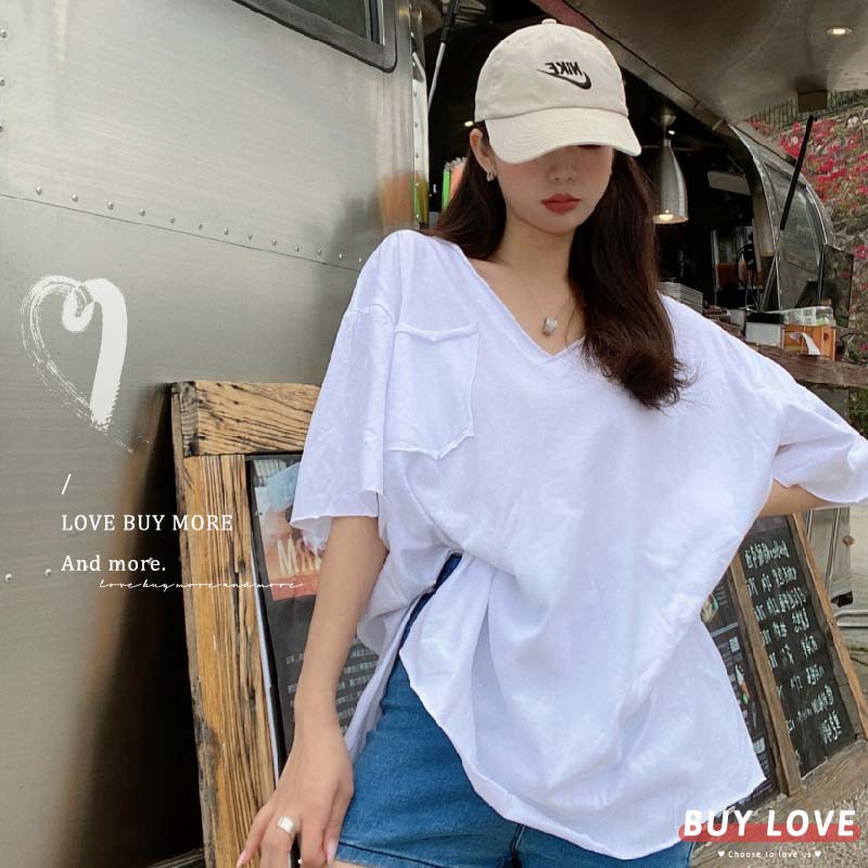 【買到戀愛】現貨出清 實拍韓系大V嶺側開岔口袋寬鬆短袖上衣 T恤【FA034】