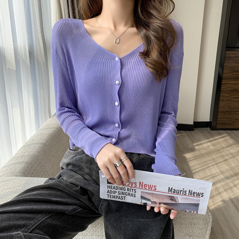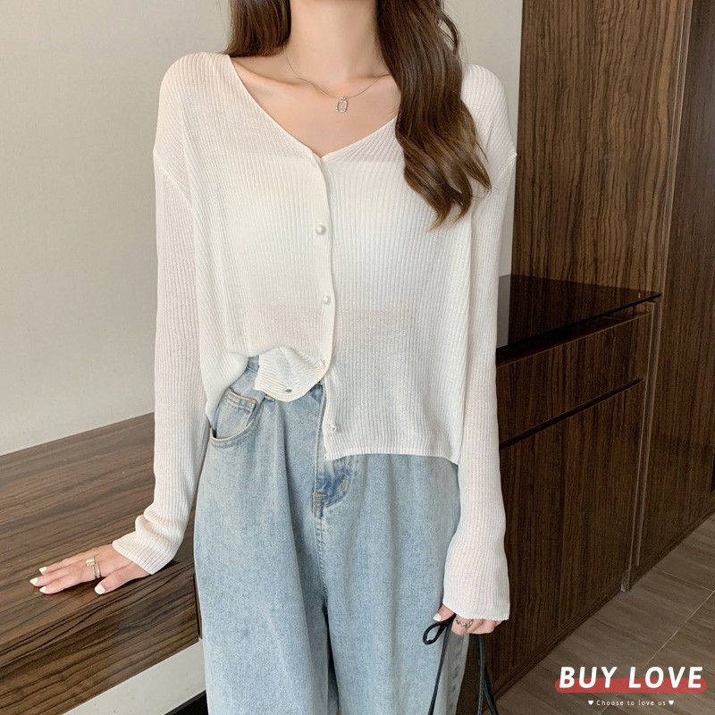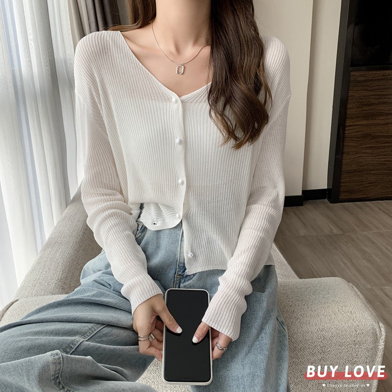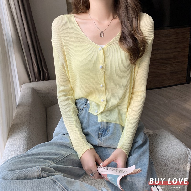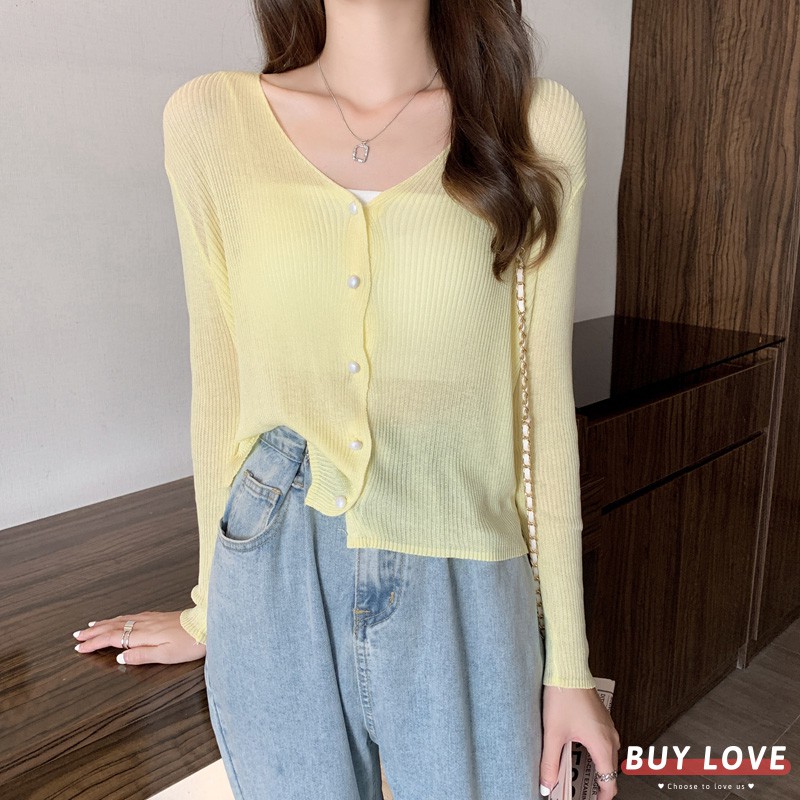 【買到戀愛】售完不補 氣質款V領小珍珠排釦薄針織小外套 長袖 罩衫【Y8583】