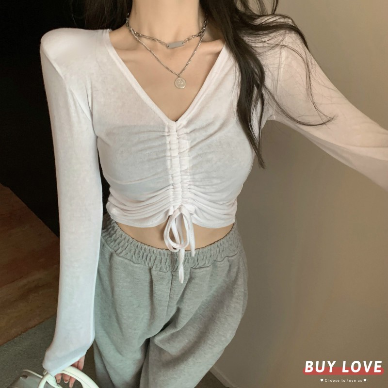 【買到戀愛】現貨出清 性感V領薄針織抽繩短版長袖上衣【FB7025】