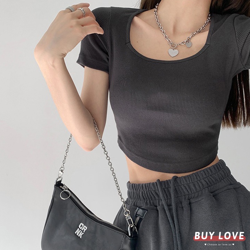 【買到戀愛】隔日到貨 U領坑條貼身短版短袖上衣 顯瘦上衣 女上衣 短袖t恤 短T 素T 女裝 【FT7694】