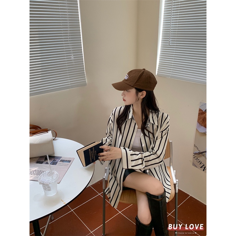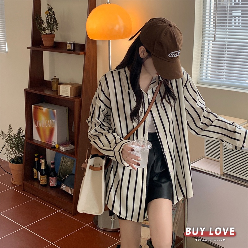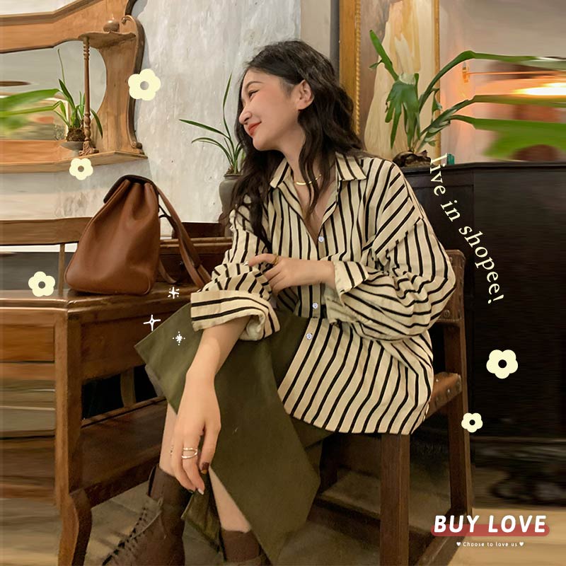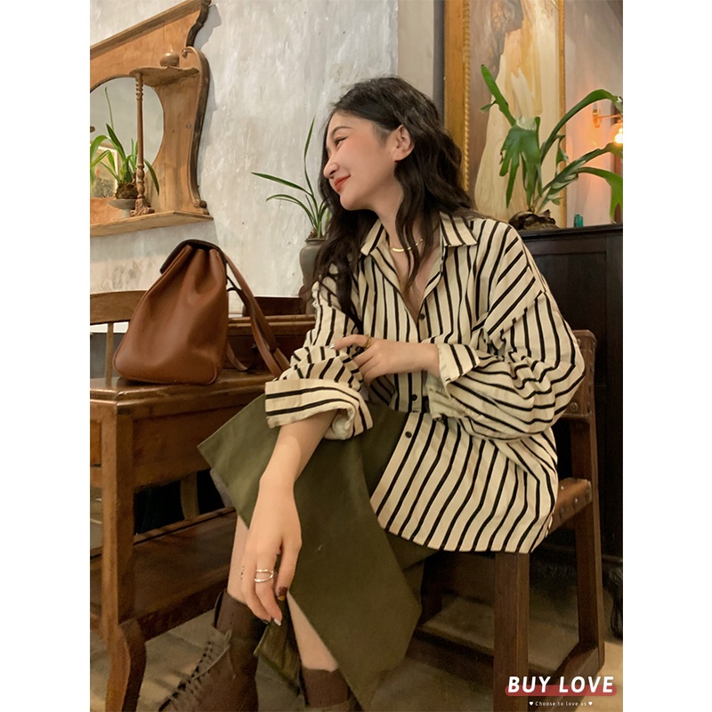 【買到戀愛】現貨出清 復古直條紋寬鬆襯衫 襯衫 素色 長袖 寬鬆襯衫 長袖 上衣 外套 長袖襯衫 【FT9280】