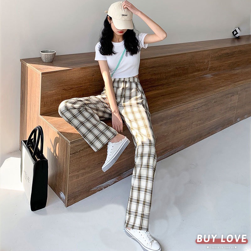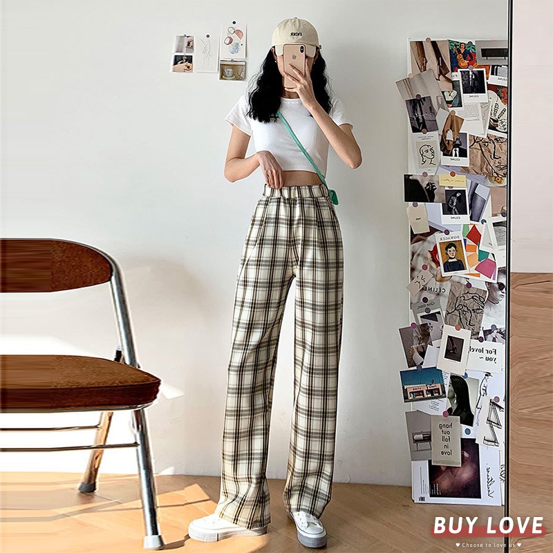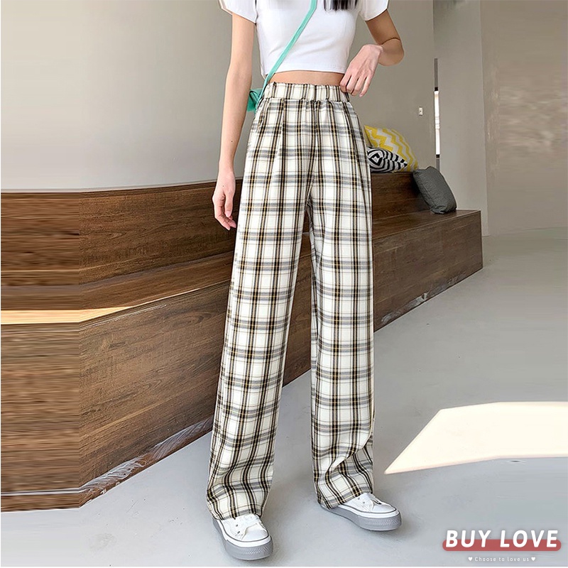 【買到戀愛】現貨 限量 格紋鬆緊腰落地寬褲 拖地褲 休閒褲 褲子 女裝 長褲 闊腿褲 老爹褲 落地褲【HL8860】