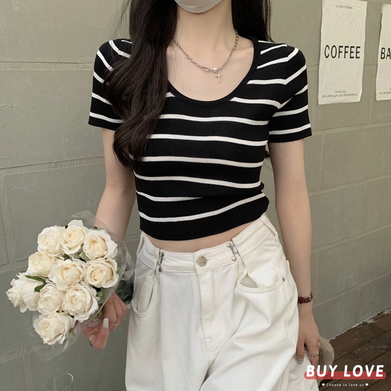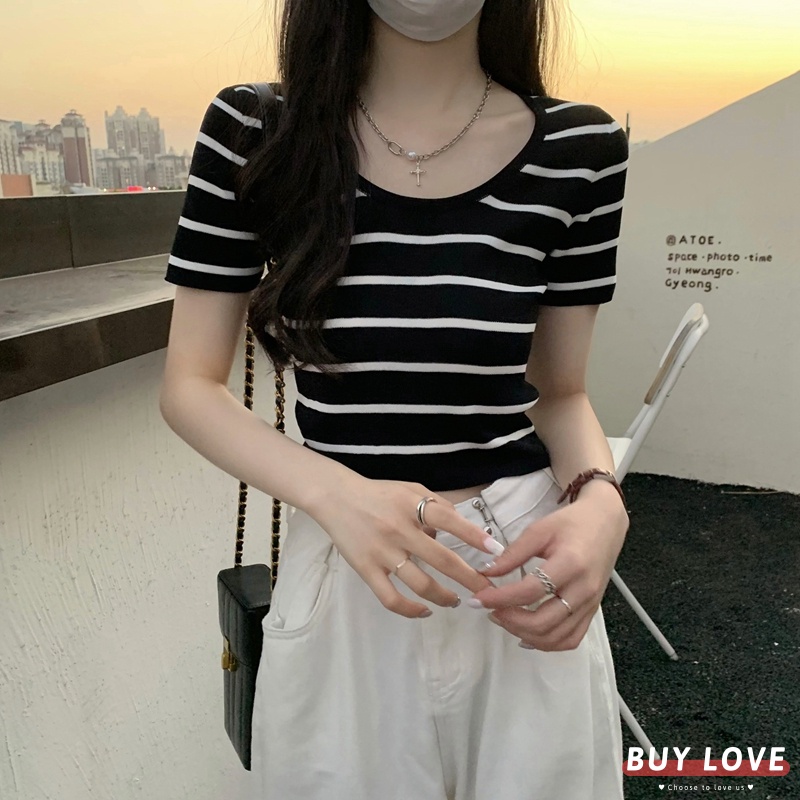 【買到戀愛】隔日到貨 U領條紋針織短袖上衣 顯瘦上衣 女上衣 短袖t恤 短T 素T 女裝 寬鬆上衣【FT5822】