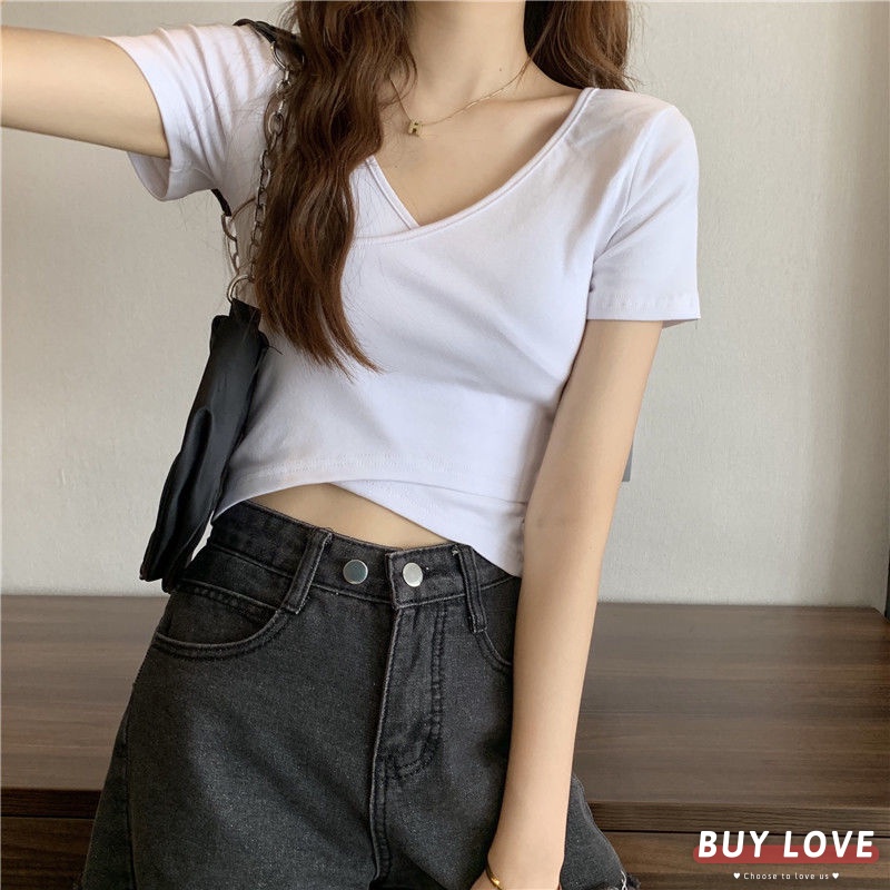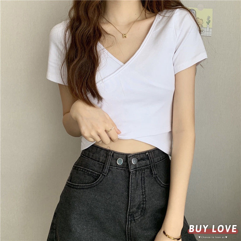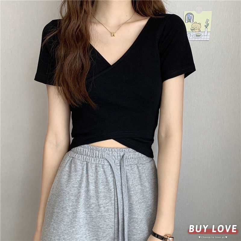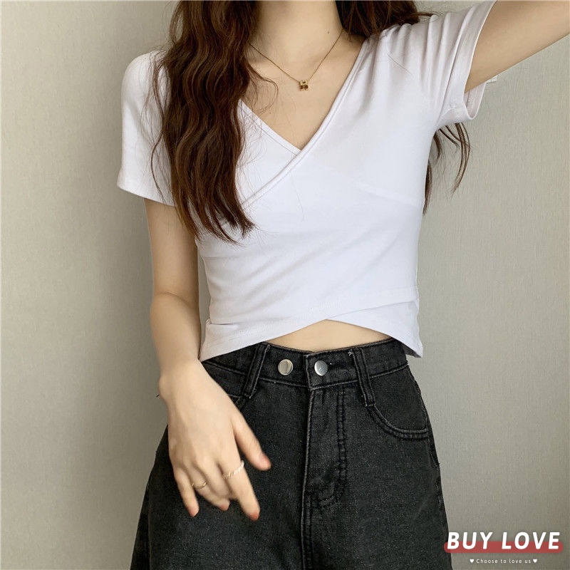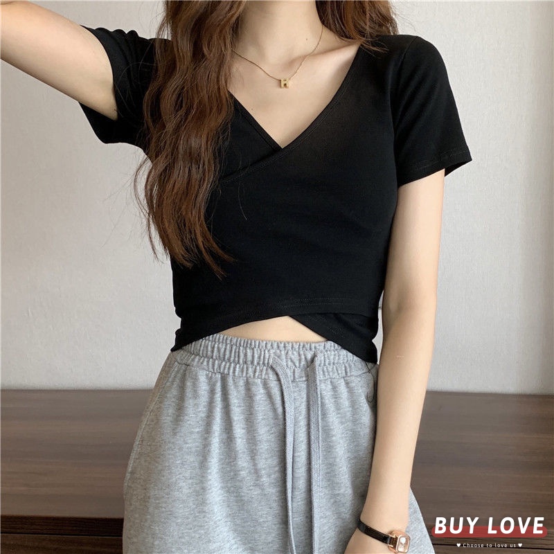 【買到戀愛】 女裝 交叉修身百搭短袖上衣 顯瘦上衣 女上衣 短袖t恤 短T 素T 女裝 寬鬆上衣【FT1231】