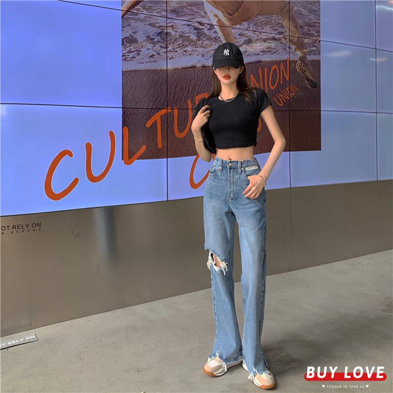 【買到戀愛】現貨出清 多碼微喇叭破洞側開叉牛仔褲 牛仔褲 顯瘦 長褲 女裝 下身【HL0073】