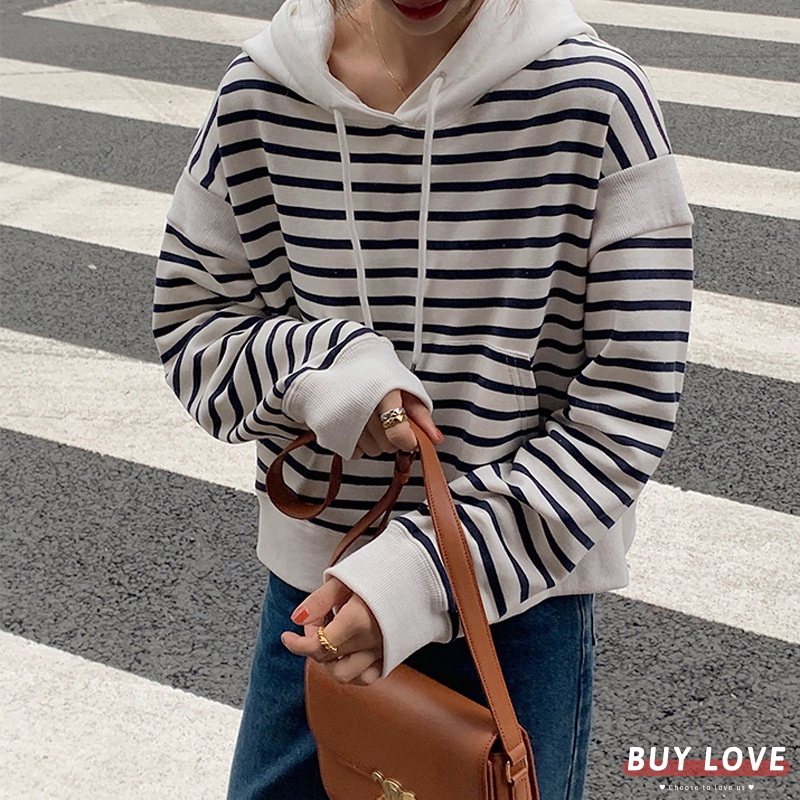 【買到戀愛】現貨出清 百搭條紋連帽衛衣 帽T 大學T 長袖 短版上衣 長袖上衣 女上衣 女裝 【FB23】