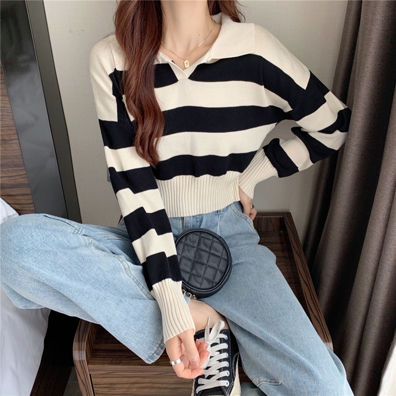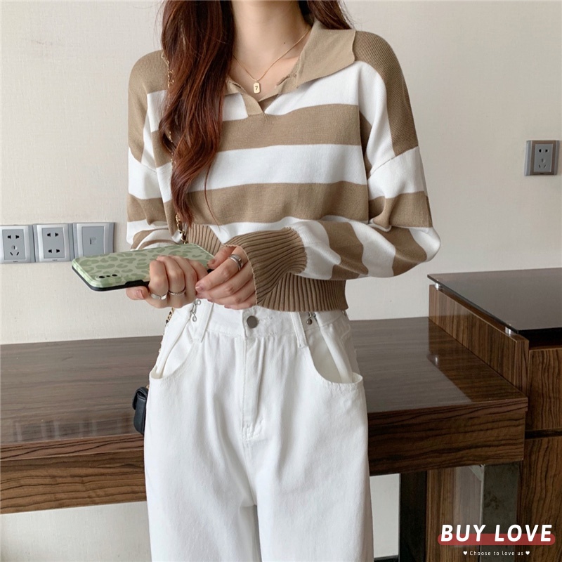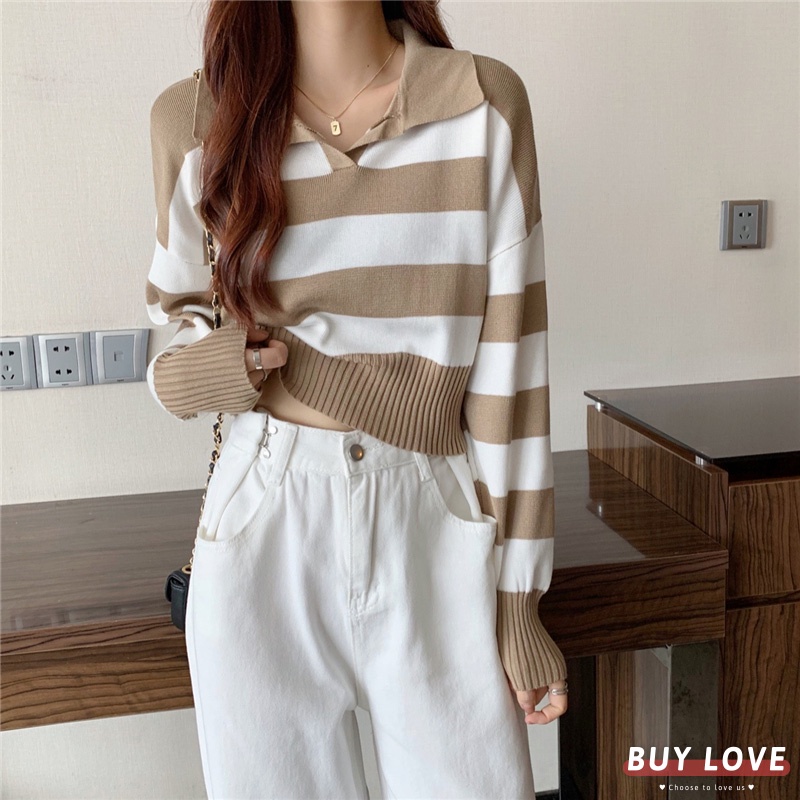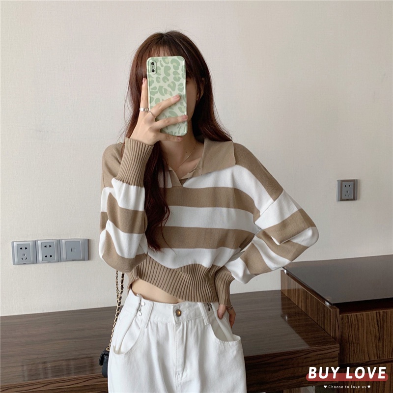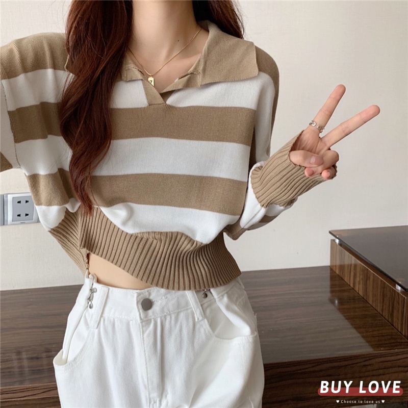 【買到戀愛】 隔日到貨 女裝 polo領條紋薄針織上衣 帽T 大學T 長袖【FB0320】
