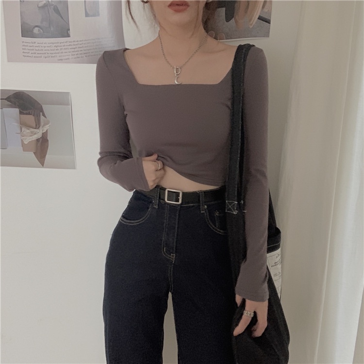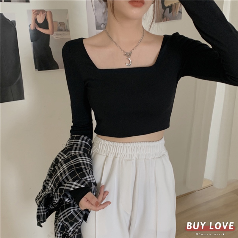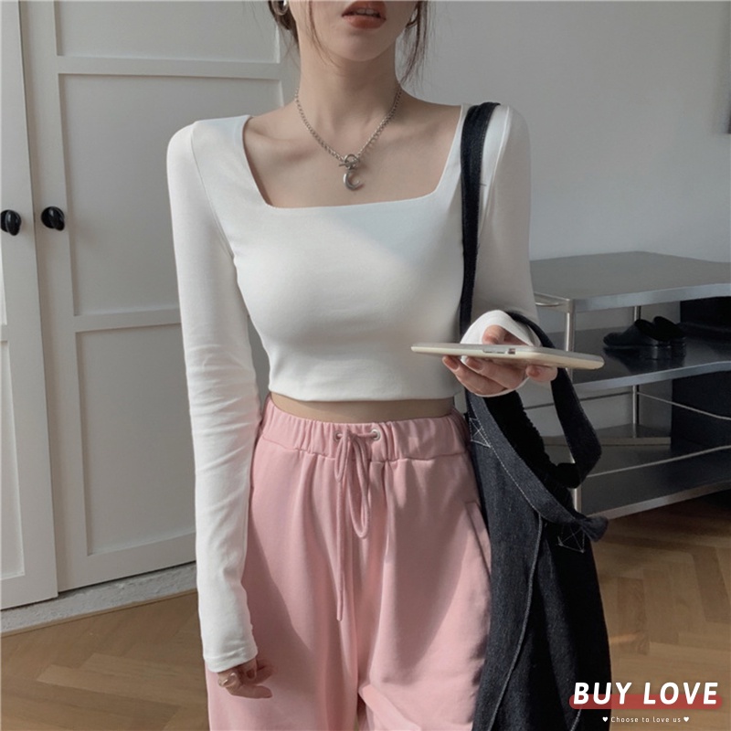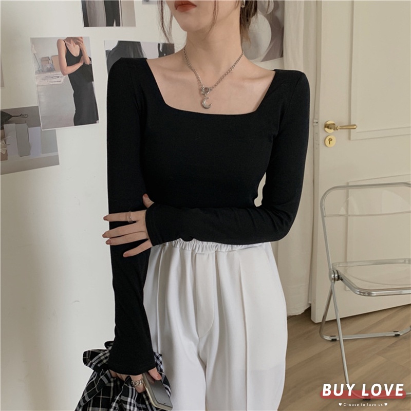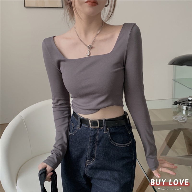 【買到戀愛】隔日到貨 百搭方領短版貼身長袖上衣 長袖 上衣 女上衣 女裝 貼身 打底衫【FB144】