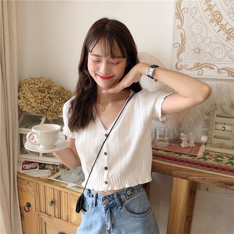 【買到戀愛】隔日到貨 韓妞短版V領顯瘦針織外套 短版上衣 針織短袖 短t 短襯衫 針織衫 上衣【FY010】