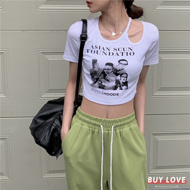 【買到戀愛】復古圖片挖肩短版棉T 短袖上衣 T恤顯瘦上衣 女上衣短袖t恤 短T 素T 女裝 上衣【FA019】