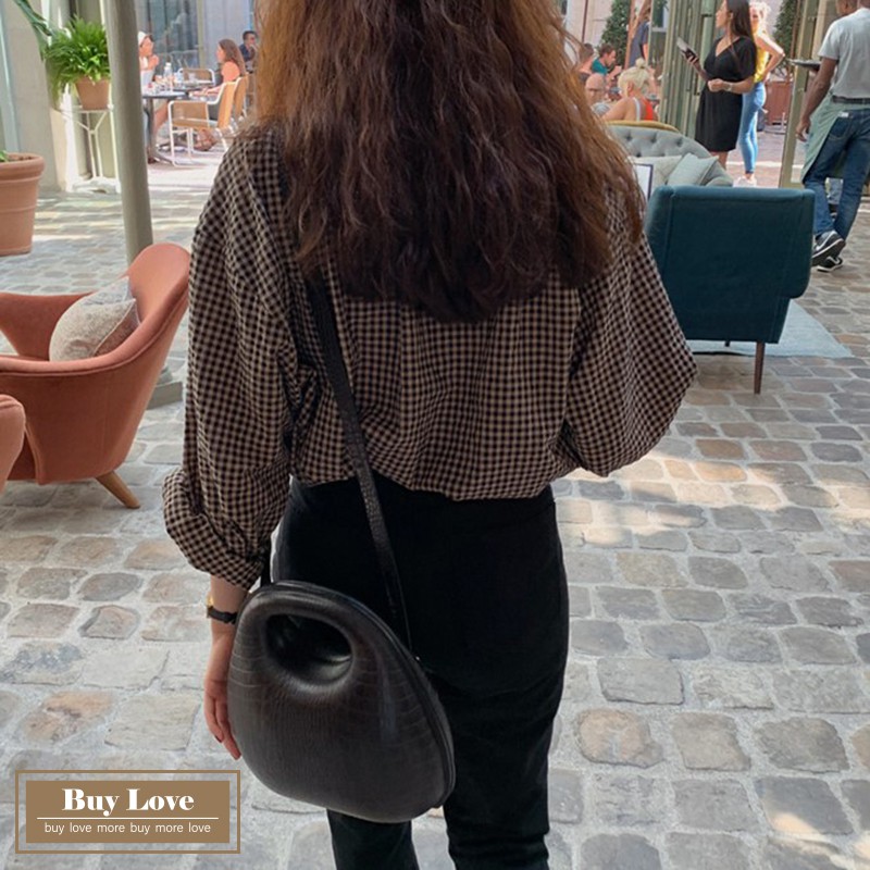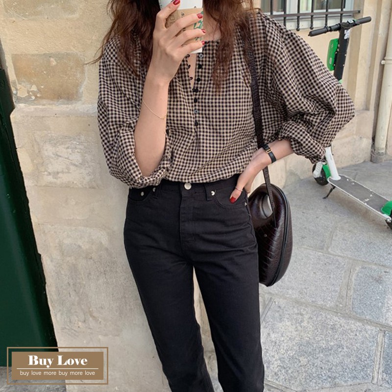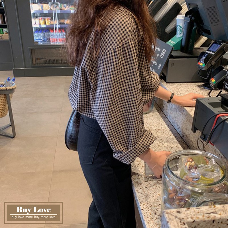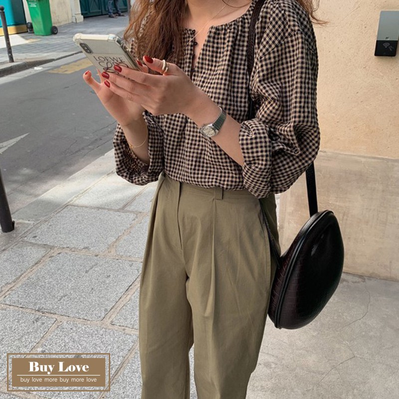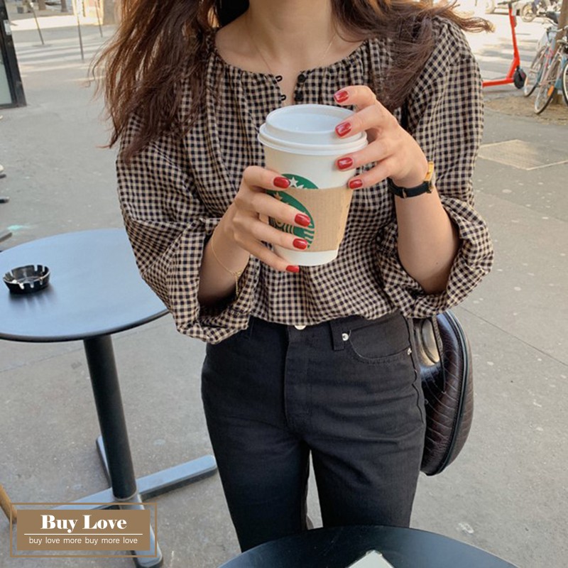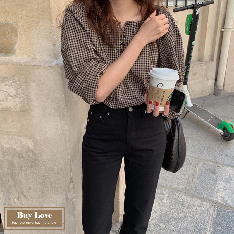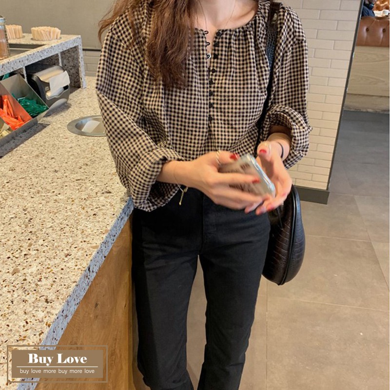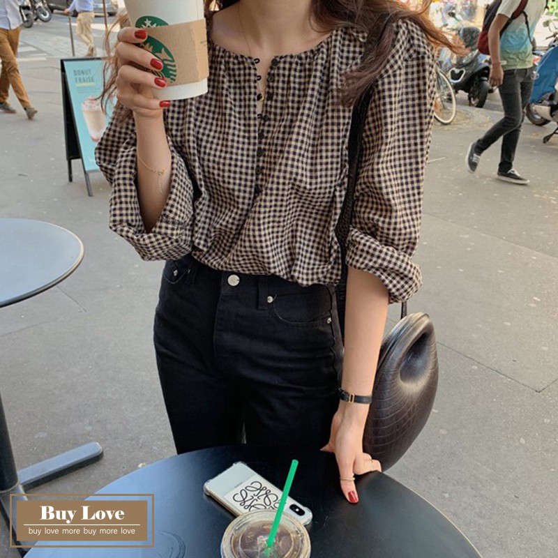 【買到戀愛】現貨出清 復古格紋圓領排扣長袖襯衫 寬鬆襯衫 長袖 上衣 外套 長袖襯衫 格紋襯衫【FY8897】