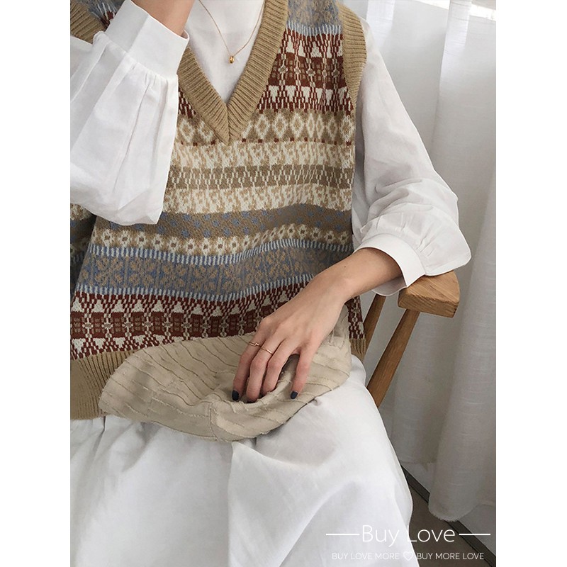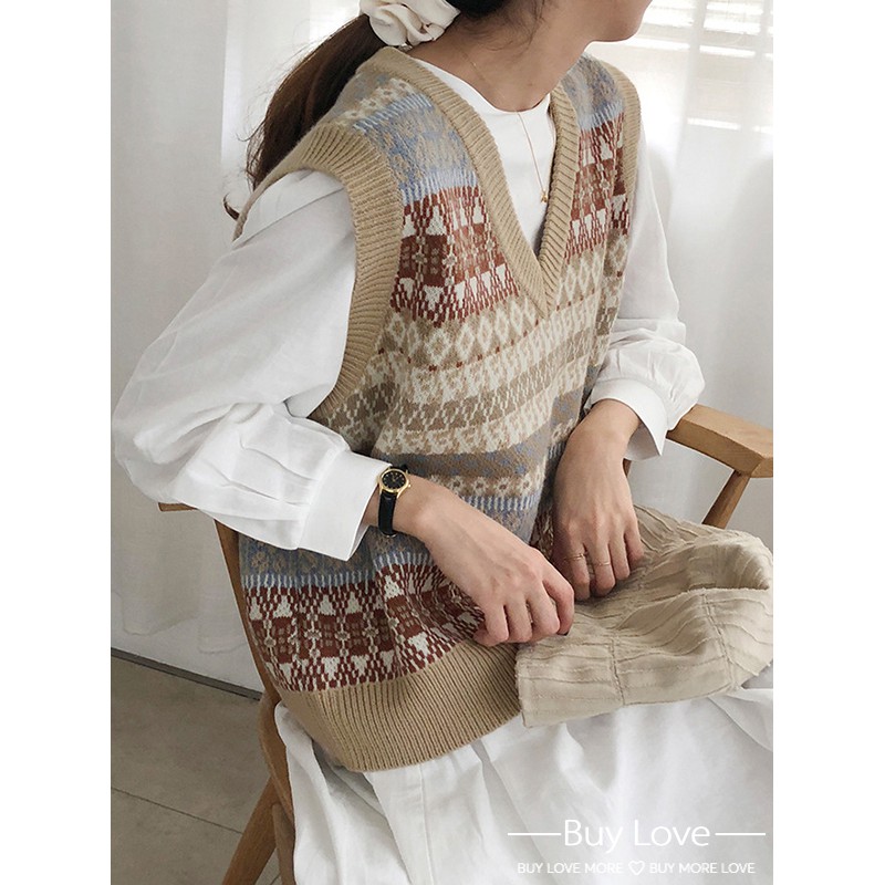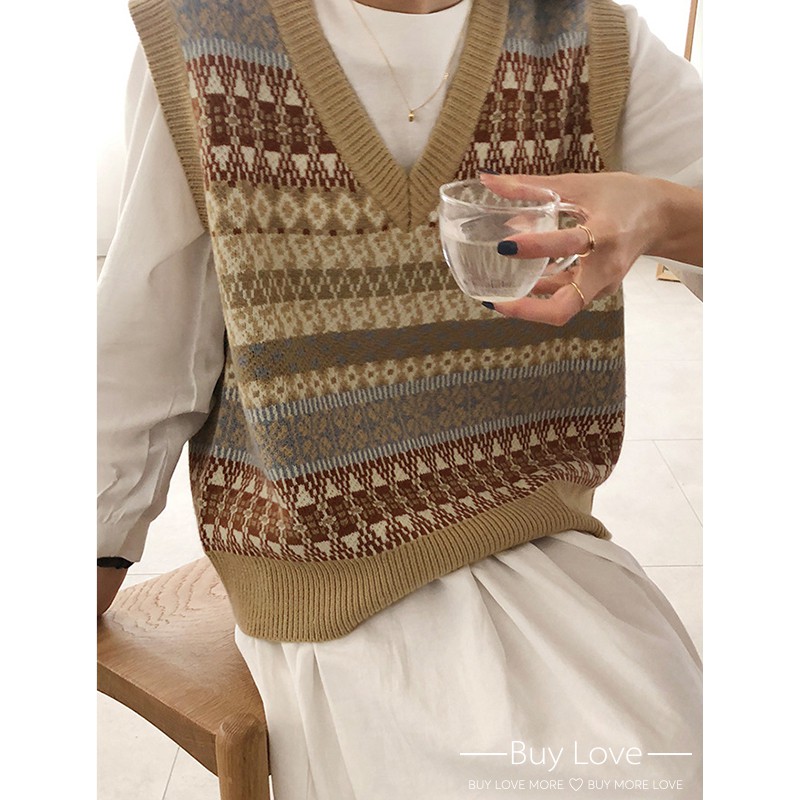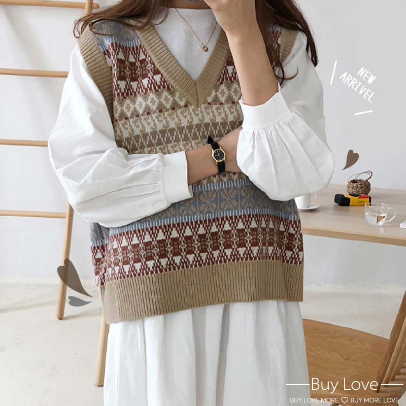 【買到戀愛】隔日到貨 復古摩卡圖騰短版外搭背心 秋冬 針織背心 毛衣 女裝 上衣【M995】