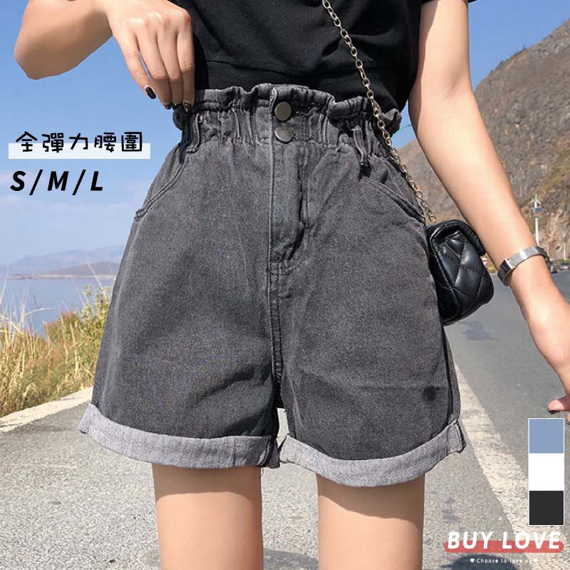 【買到戀愛】多碼超顯瘦彈性腰圍花苞捲邊牛仔短褲 熱褲 丹寧 【HS663】