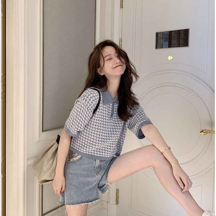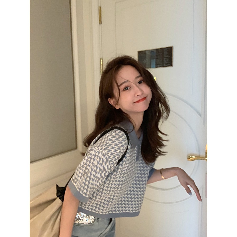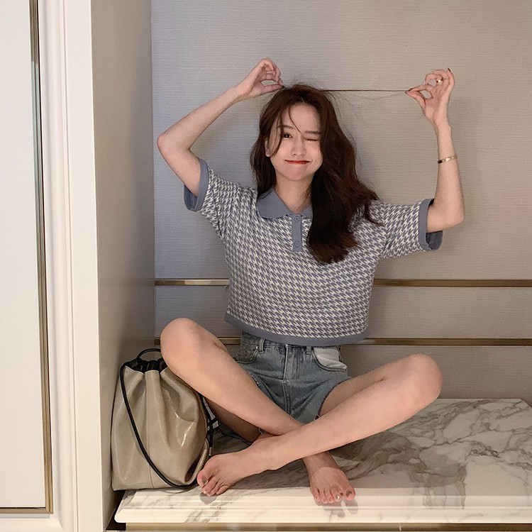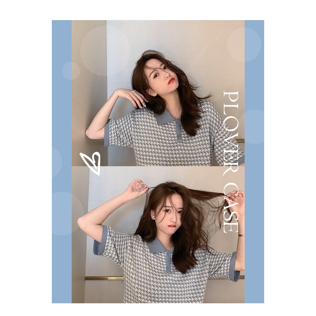 【買到戀愛】CHIC韓妞千鳥格短版 POLO衫 女上衣 翻領 寬鬆上衣 短版上衣 女裝 上衣【FY2094】