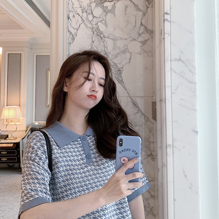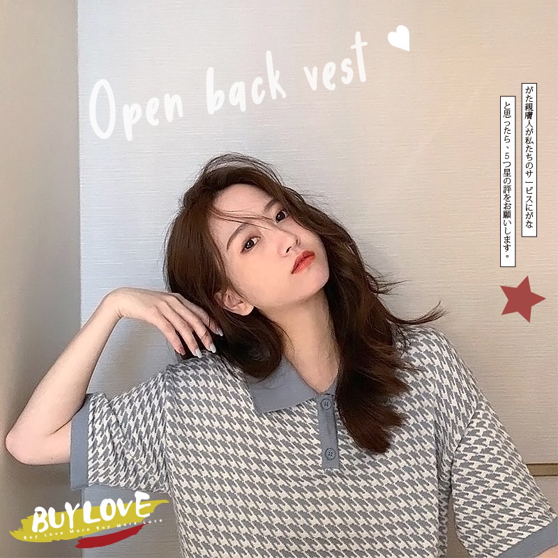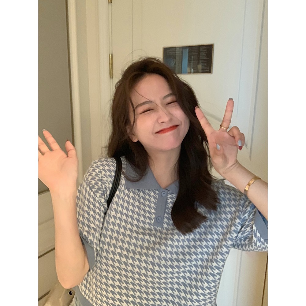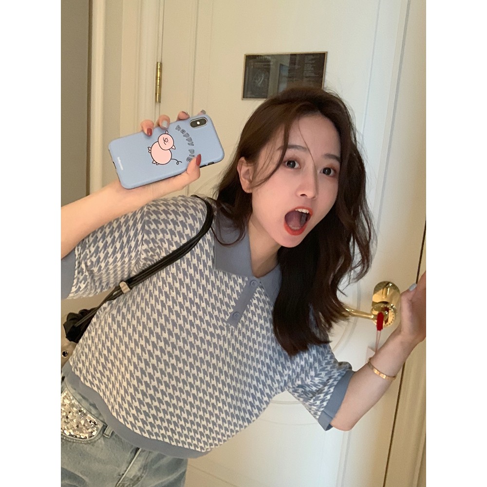 【買到戀愛】CHIC韓妞千鳥格短版 POLO衫 女上衣 翻領 寬鬆上衣 短版上衣 女裝 上衣【FY2094】