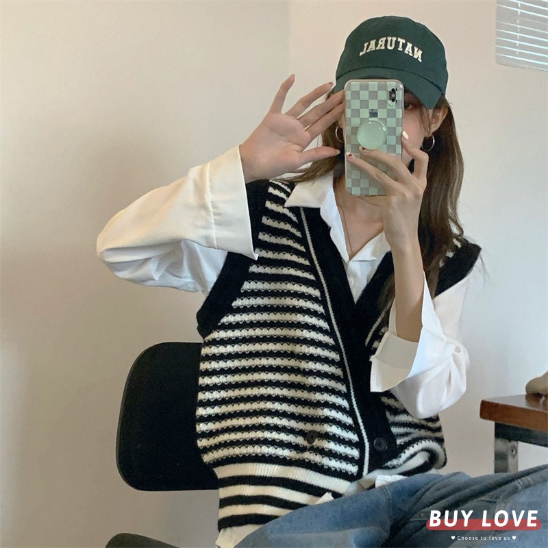 【買到戀愛 售完不補 針織不規則交岔V領開釦條紋長版外搭背心 【M107】