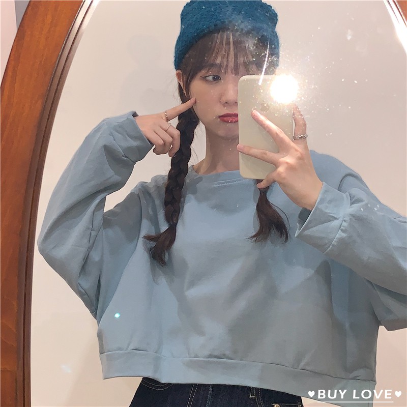 【買到戀愛】 隔日到貨 女裝 百搭大學T圓領短版衛衣 上衣 短版大學T 長袖上衣 素t 長袖t 短版t 【FR322】