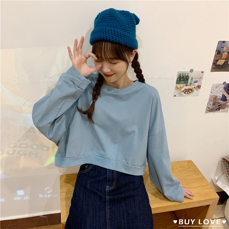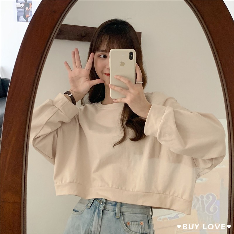 【買到戀愛】 隔日到貨 百搭大學T圓領短版衛衣 上衣 短版大學T 長袖上衣 素t 長袖t 短版t 【FR322】