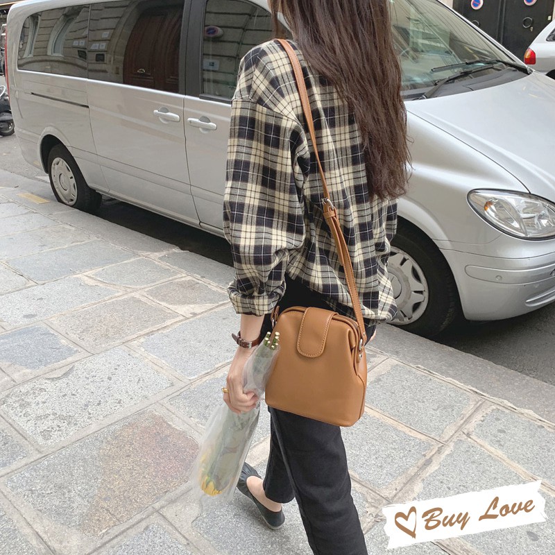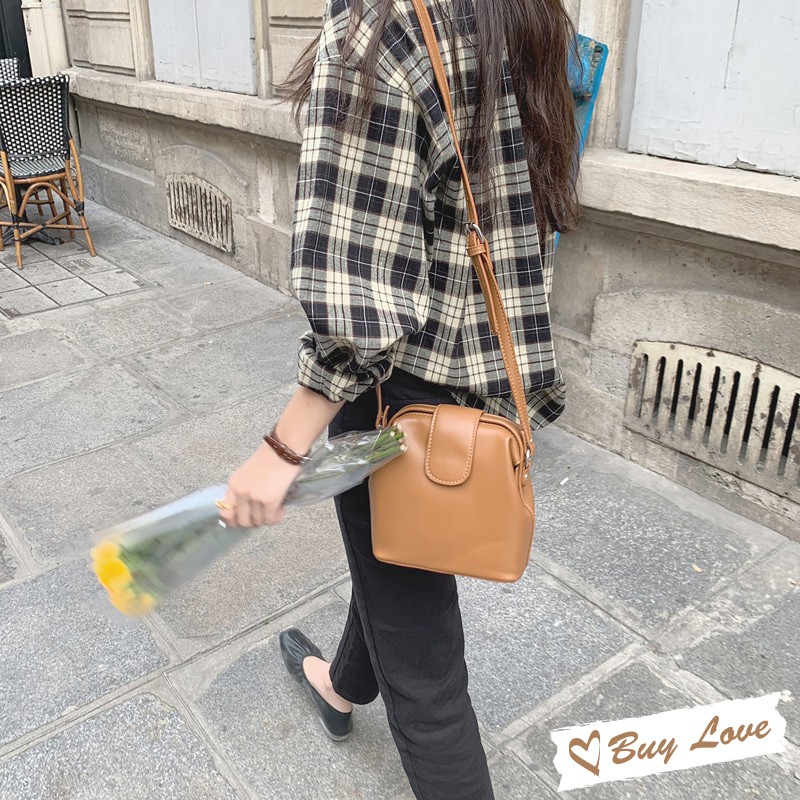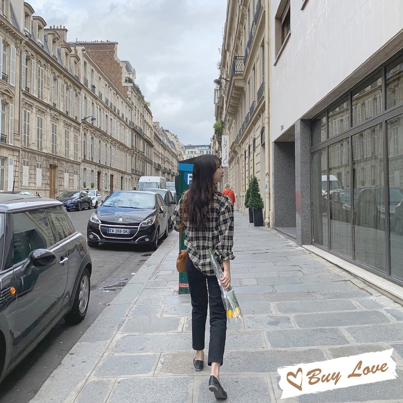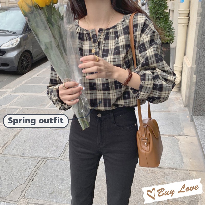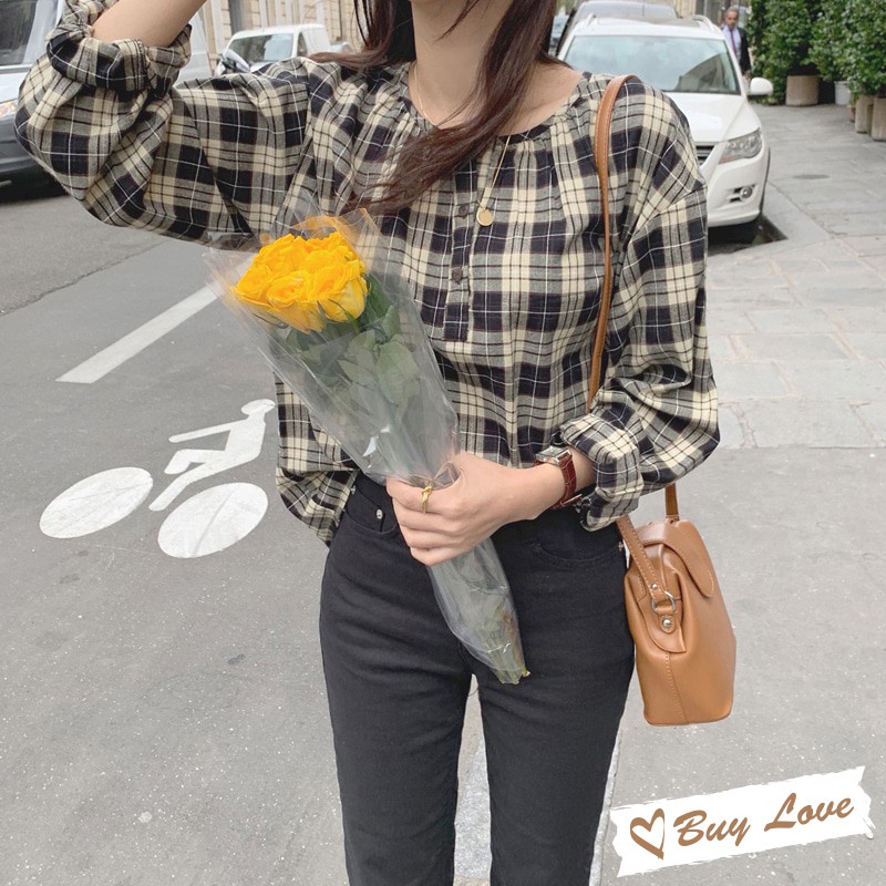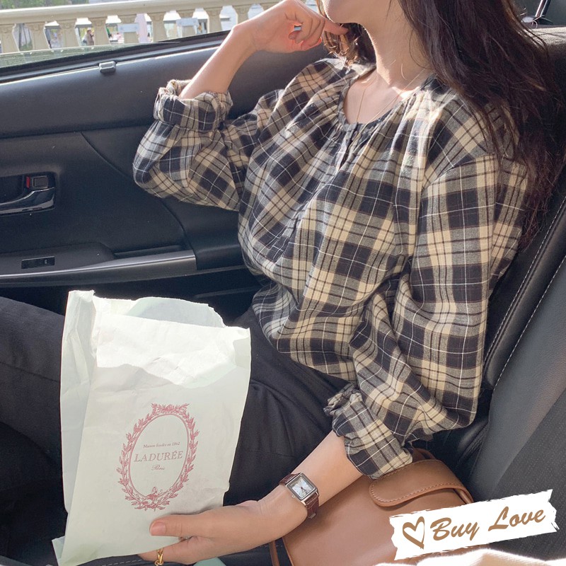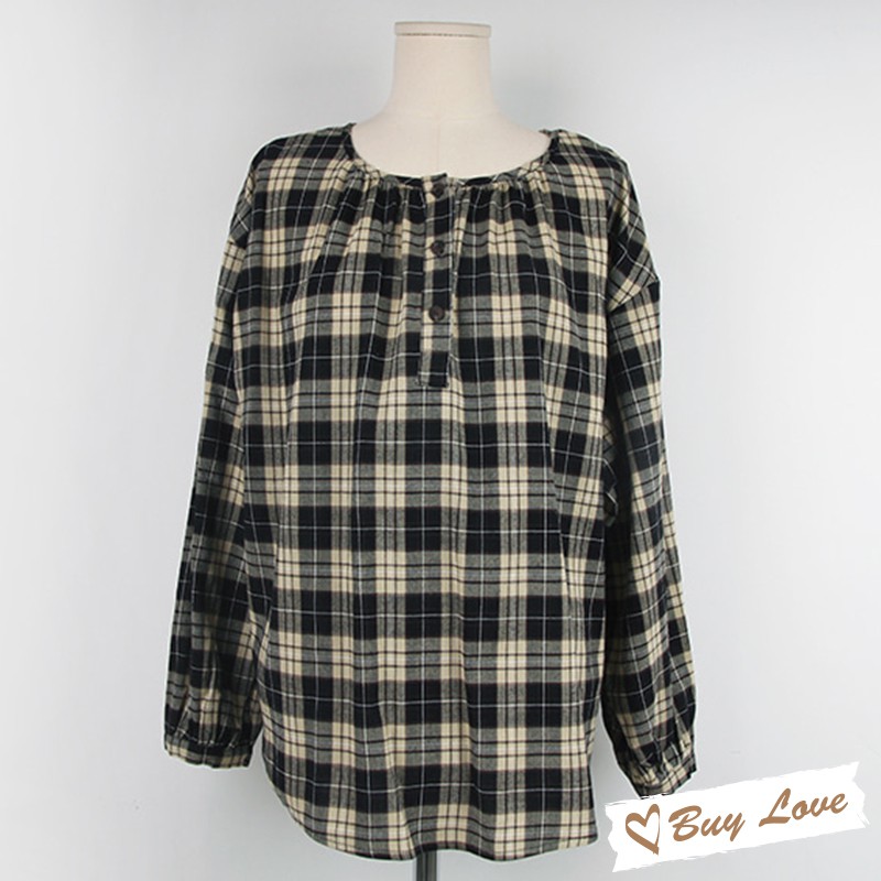 【買到戀愛】隔日到貨 限量 復古氣質圓領排扣格紋襯衫 寬鬆襯衫 長袖 上衣 外套 長袖襯衫 女裝【FY8810】