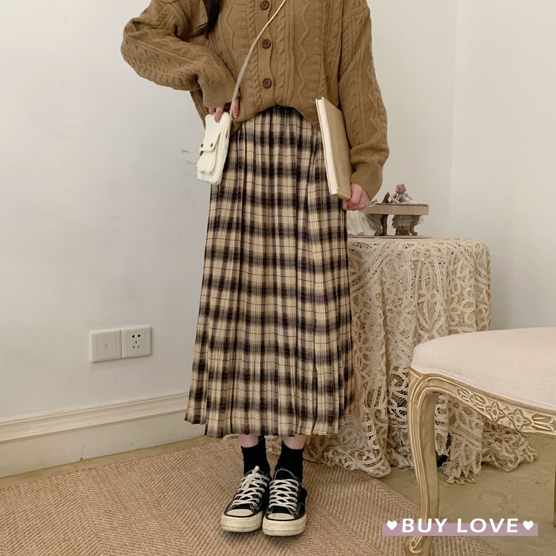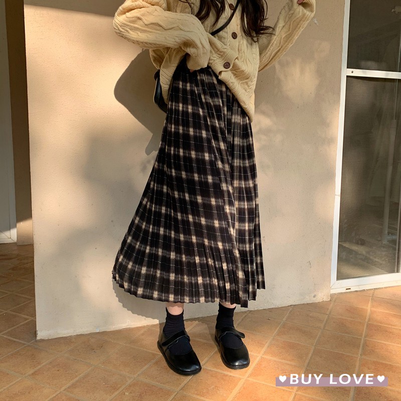 【買到戀愛】現貨出清 歐逆復古氣質格紋百褶裙 長裙 中長裙【C33119】