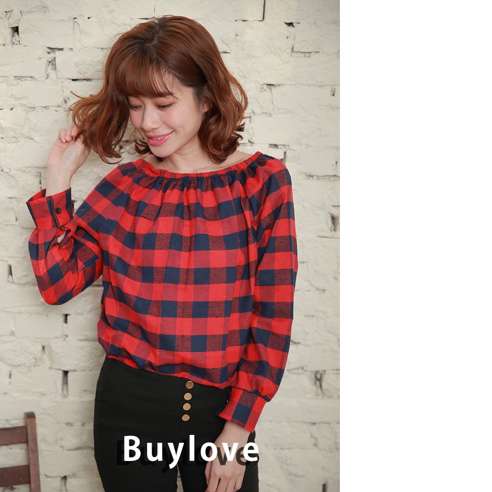 【買到戀愛】隔日到貨 限量超美一字領百搭紅格紋長袖上衣【F811】