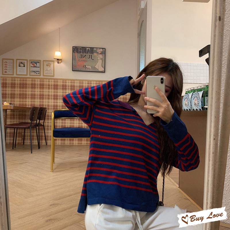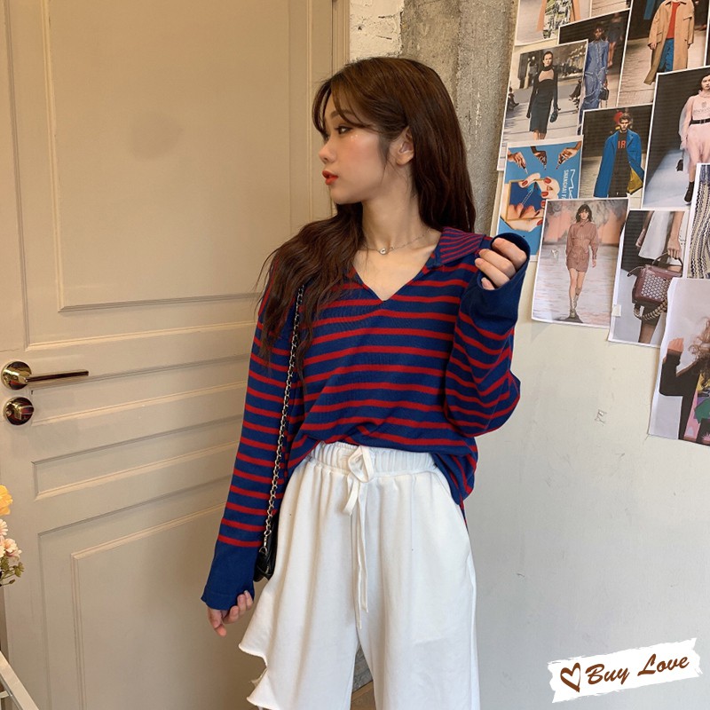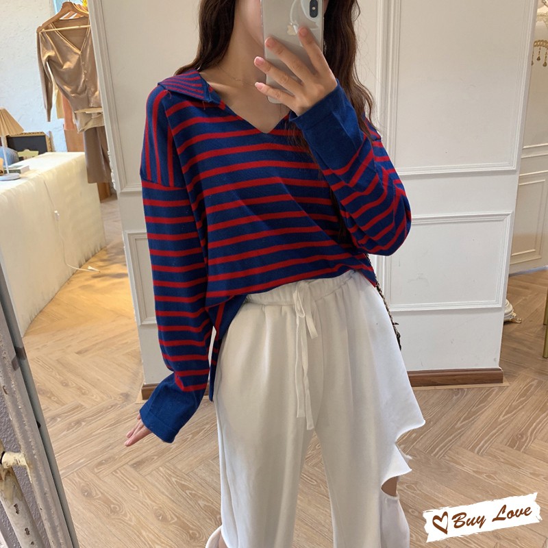 【買到戀愛】現貨出清 翻領百搭條紋長袖針織【FM1552】