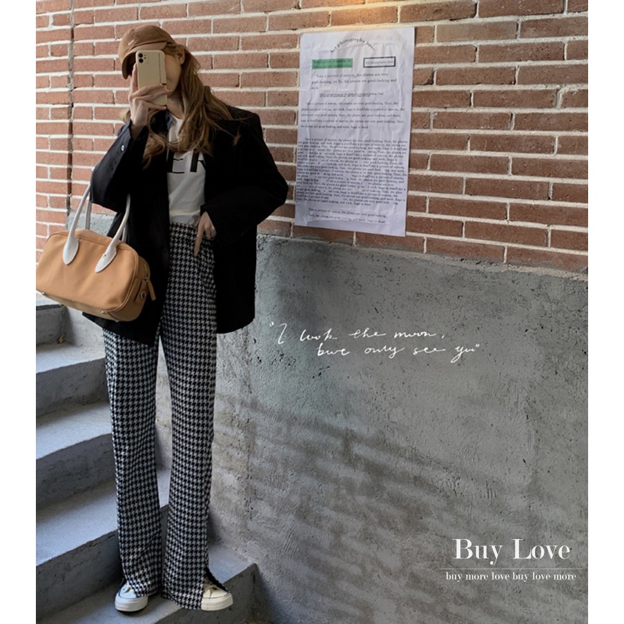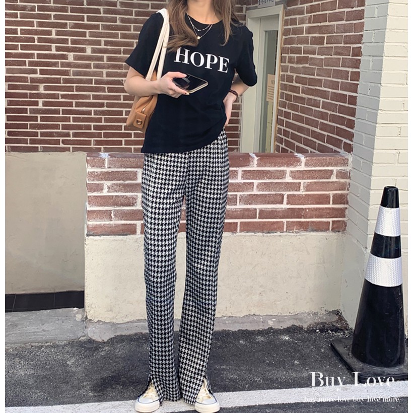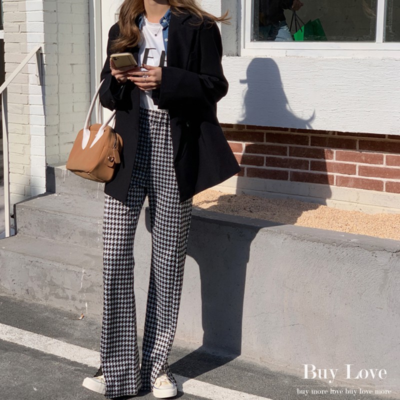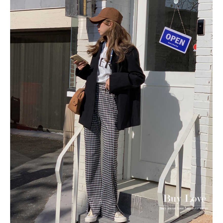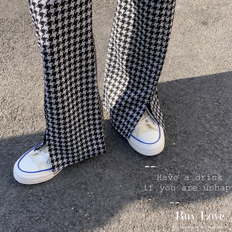 【買到戀愛】( 現貨 ) 歐逆長腿鬆緊千鳥格開岔寬褲 西裝褲 長褲 闊腿褲【HL427】