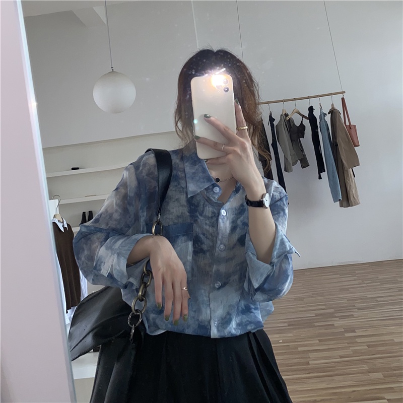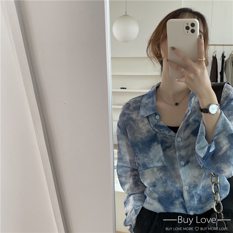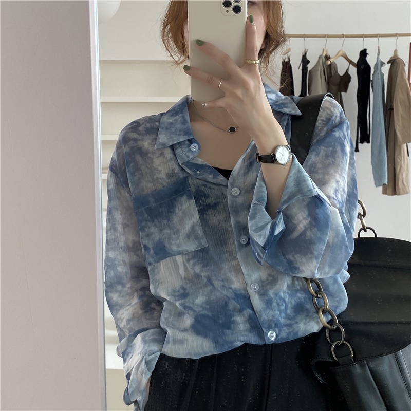 【買到戀愛】氣質藍渲染透膚雪紡襯衫 寬鬆襯衫 長袖 上衣 外套 長袖襯衫 【FA909】
