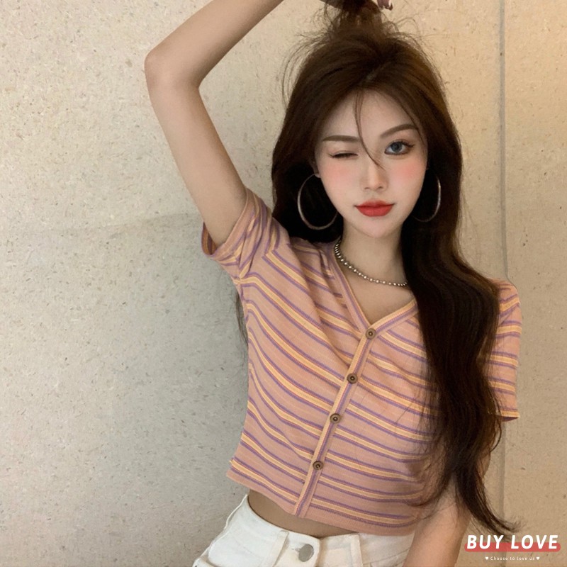 【買到戀愛】售完不補冰絲涼感條紋甜美V領短版上衣 短袖上衣【FA0614】