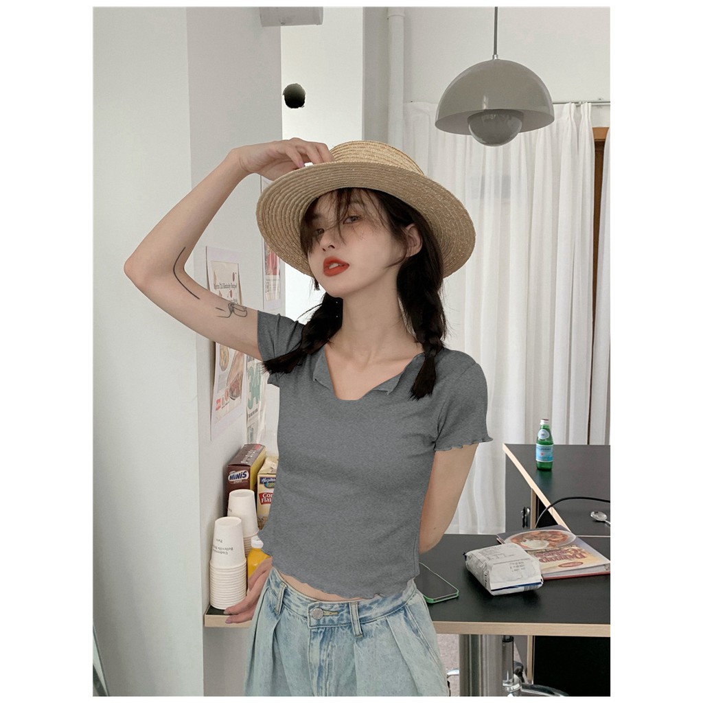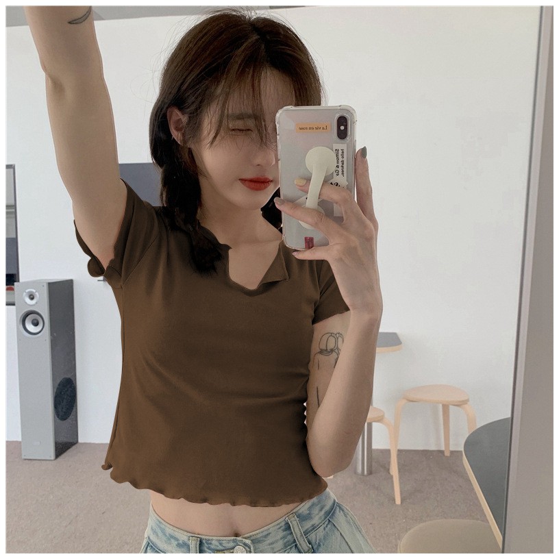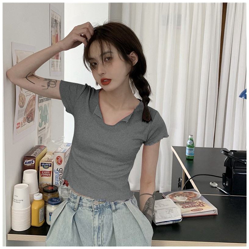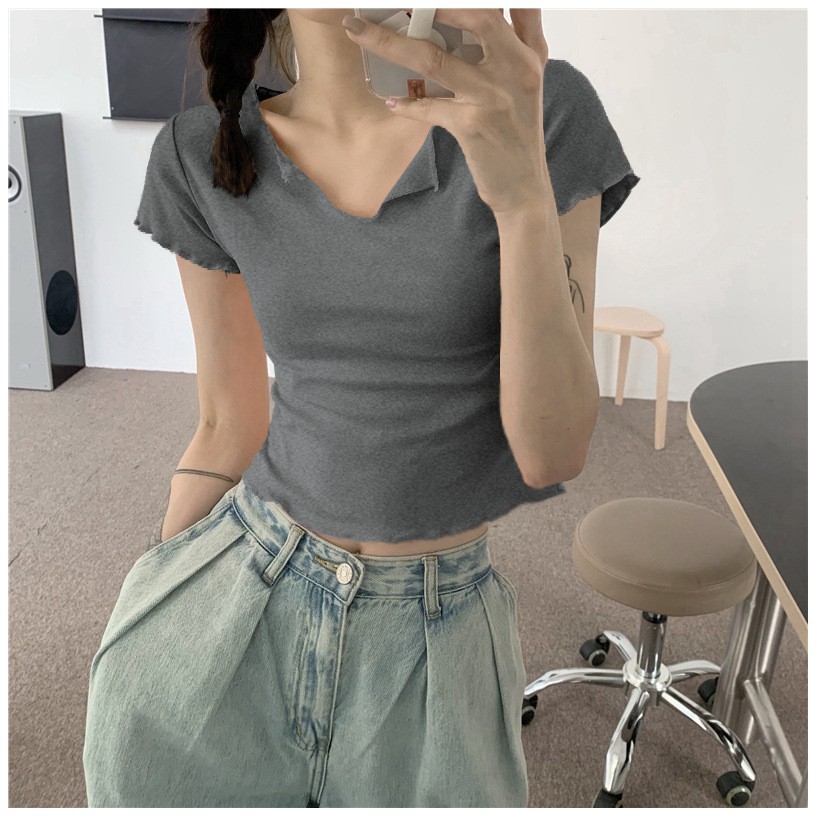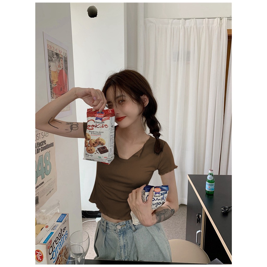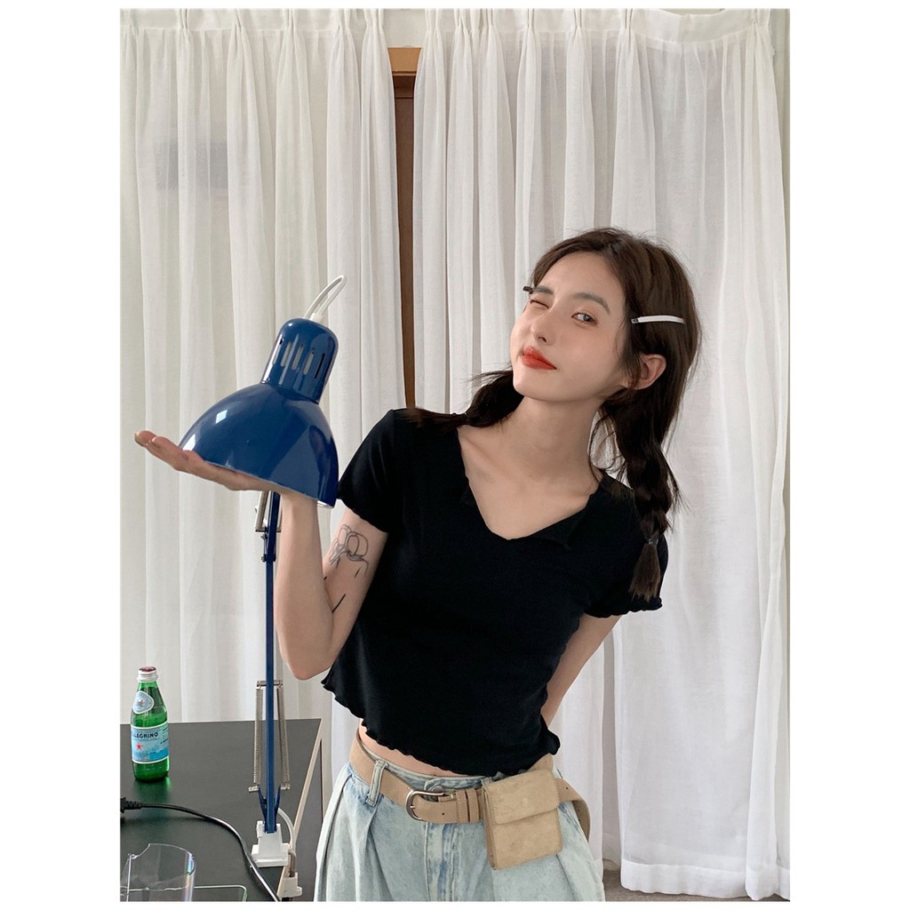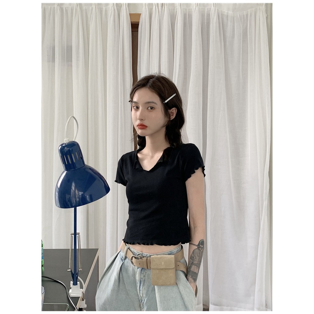 【買到戀愛】現貨出清 微性感小V領木耳邊短版短袖棉T T恤【FA023】