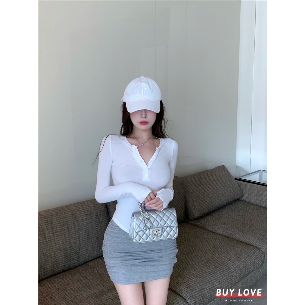 【買到戀愛】現貨出清 微透膚V領薄針織長袖+性感包臀皺褶短裙【FB0129】