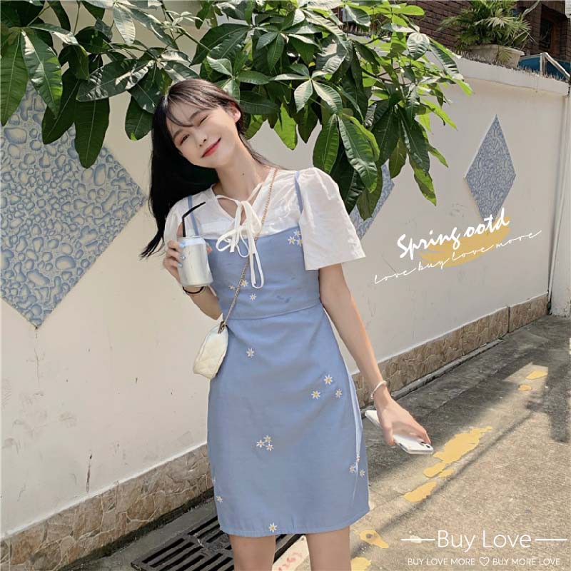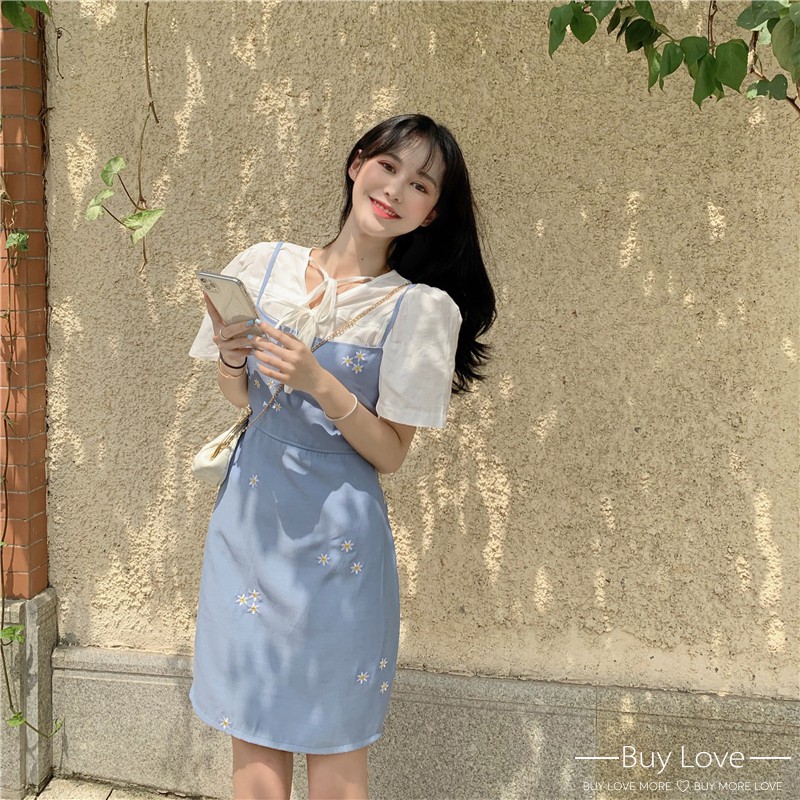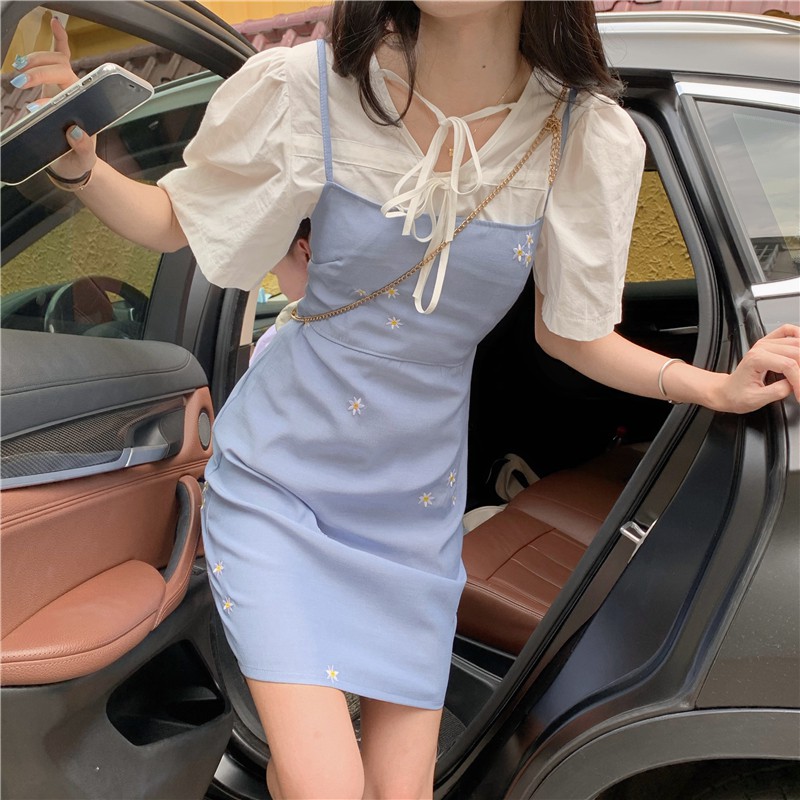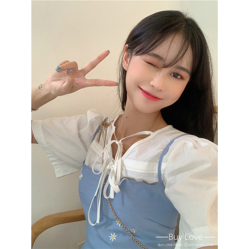 【買到戀愛】限量 仙女款白綁帶襯衫 + 水藍刺繡小花吊帶連身裙【G9089】