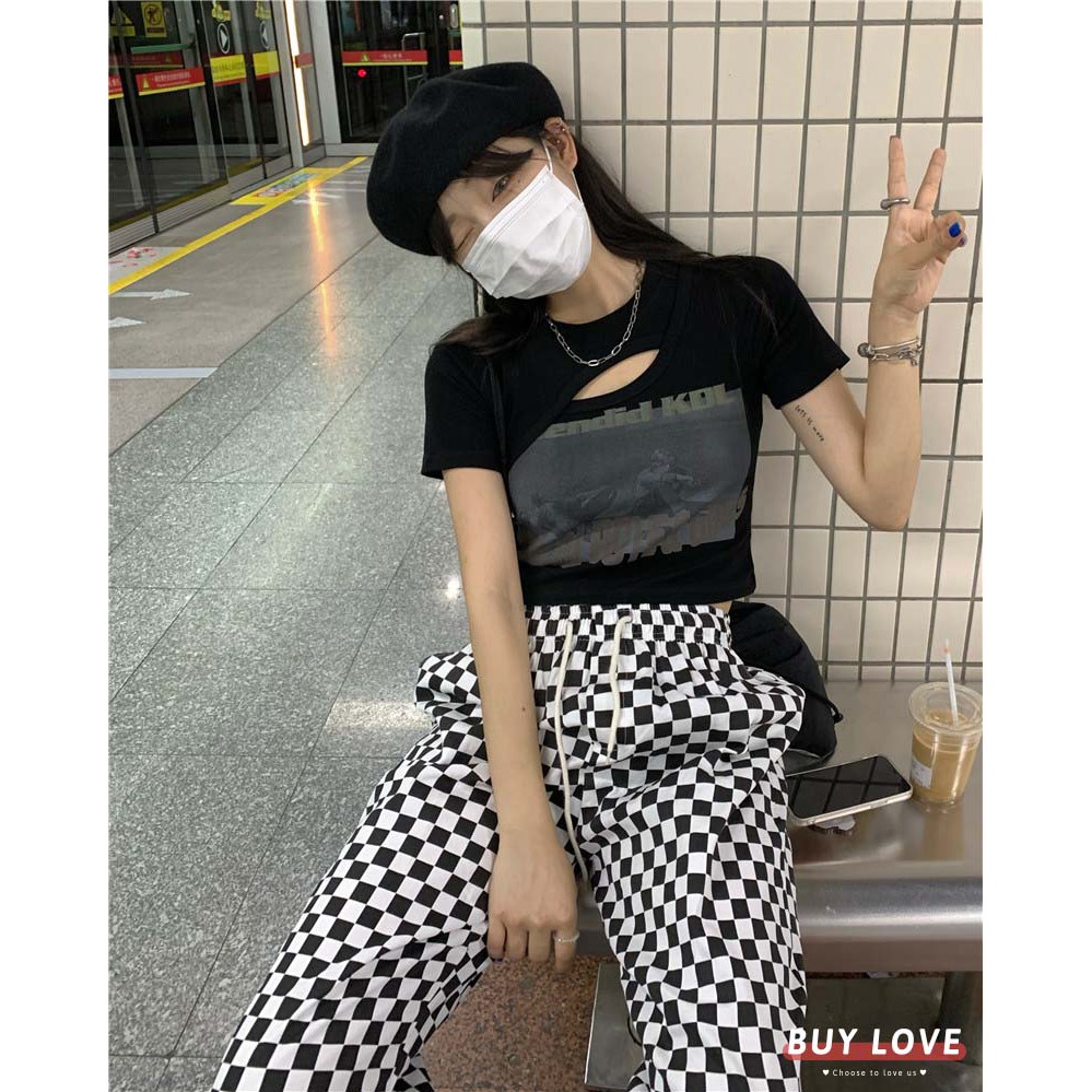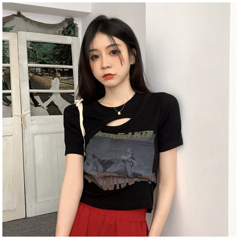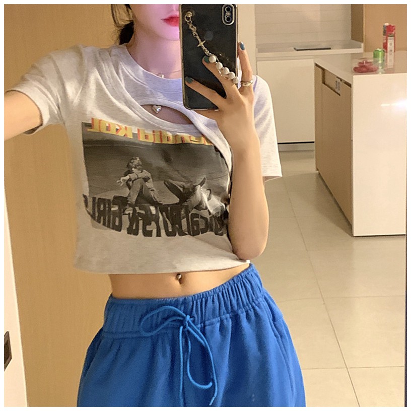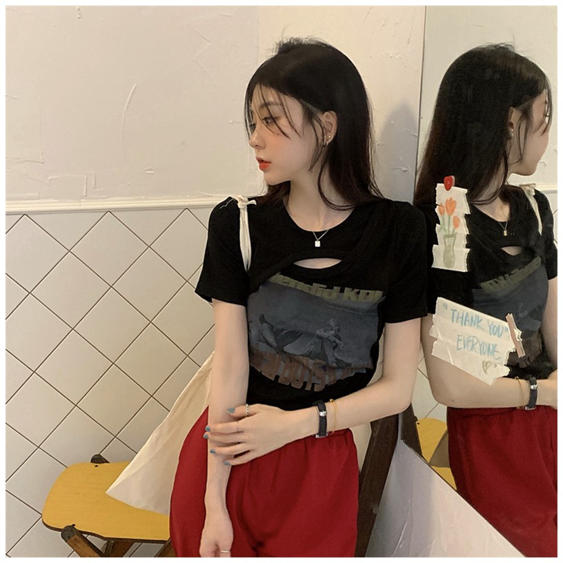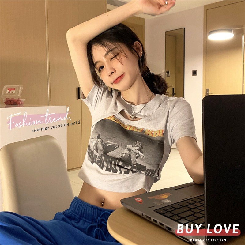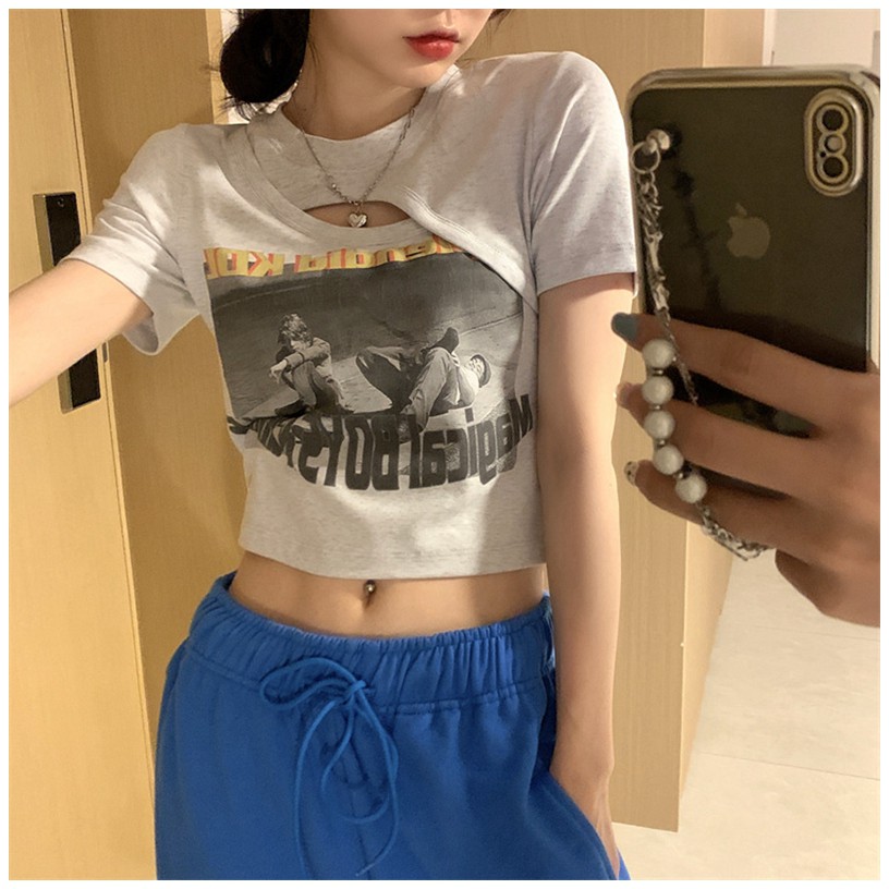 【買到戀愛】現貨出清 個性辣妹挖空假兩件相片短版上衣 T恤 短袖棉T【FA3612】