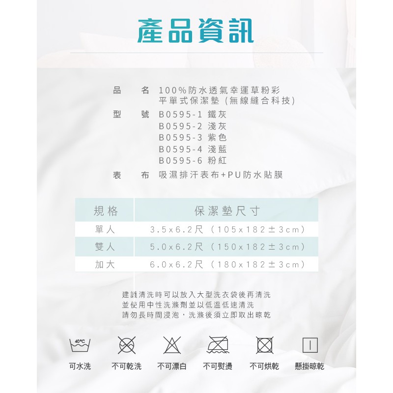 【CERES】防水透氣幸運草平單式各尺寸保潔墊五色任選(B0595-)