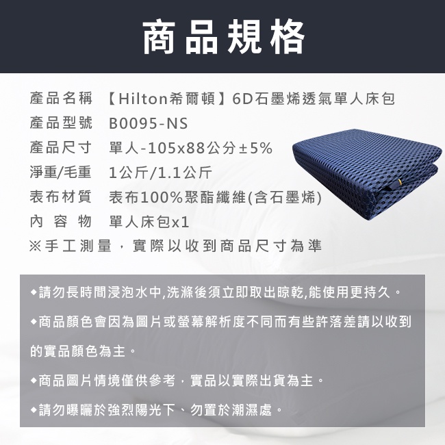 【Hilton 希爾頓】酷涼6D石墨烯蜂巢單人透氣床包/單人/B0095-NS/床包/石墨烯