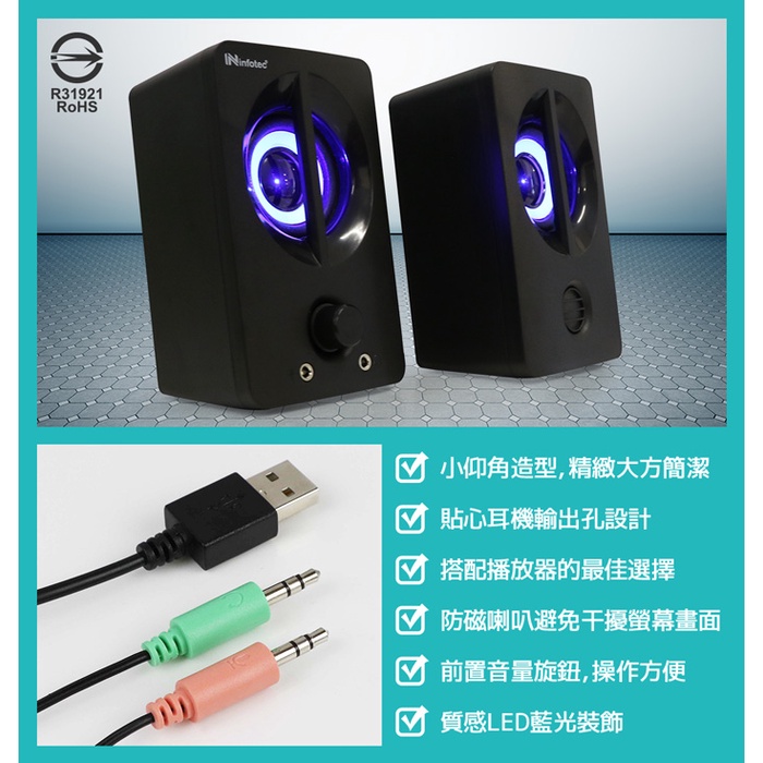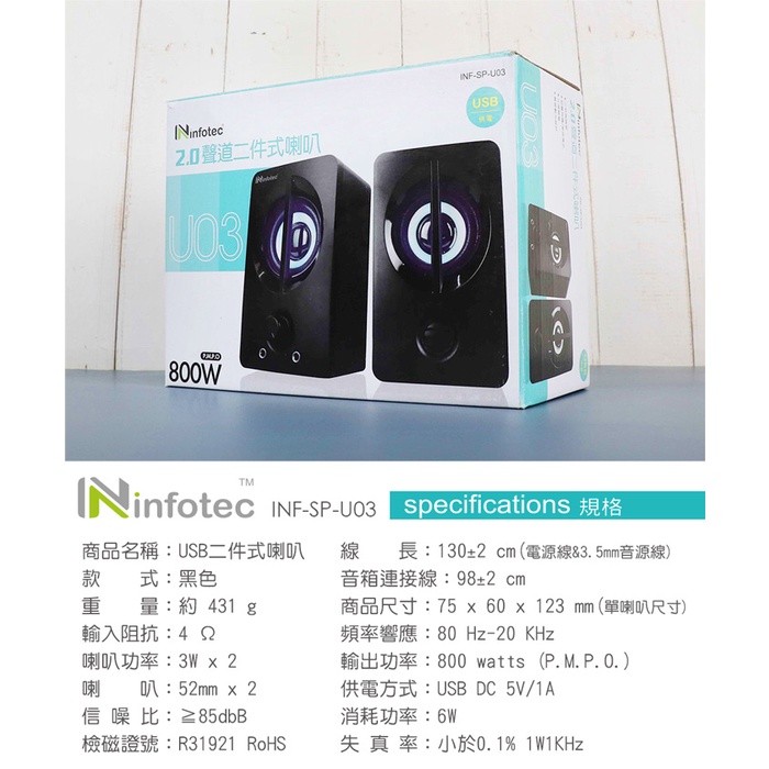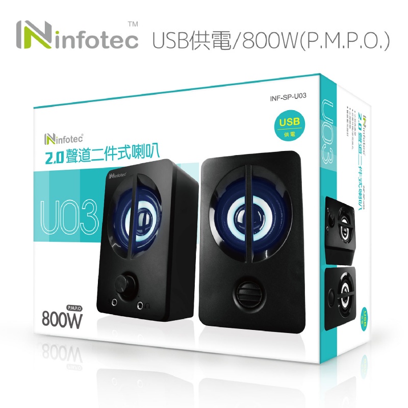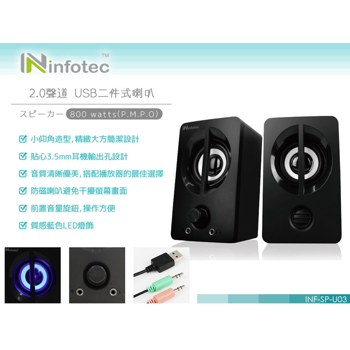 Infotec 英富達 SP-U03 800W(P.M.P.O) 2.0聲道USB二件式喇叭 防磁喇叭避免干擾螢幕畫面