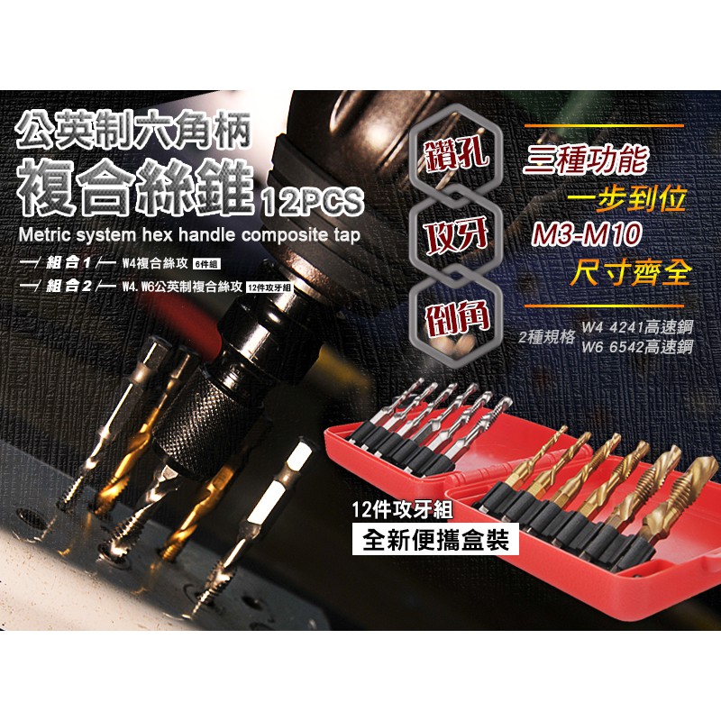 【機械堂】 W4+W6鋼 12件式便利型 4241鋼 6542高速鋼 公英制攻牙組 螺絲攻牙組 絲攻