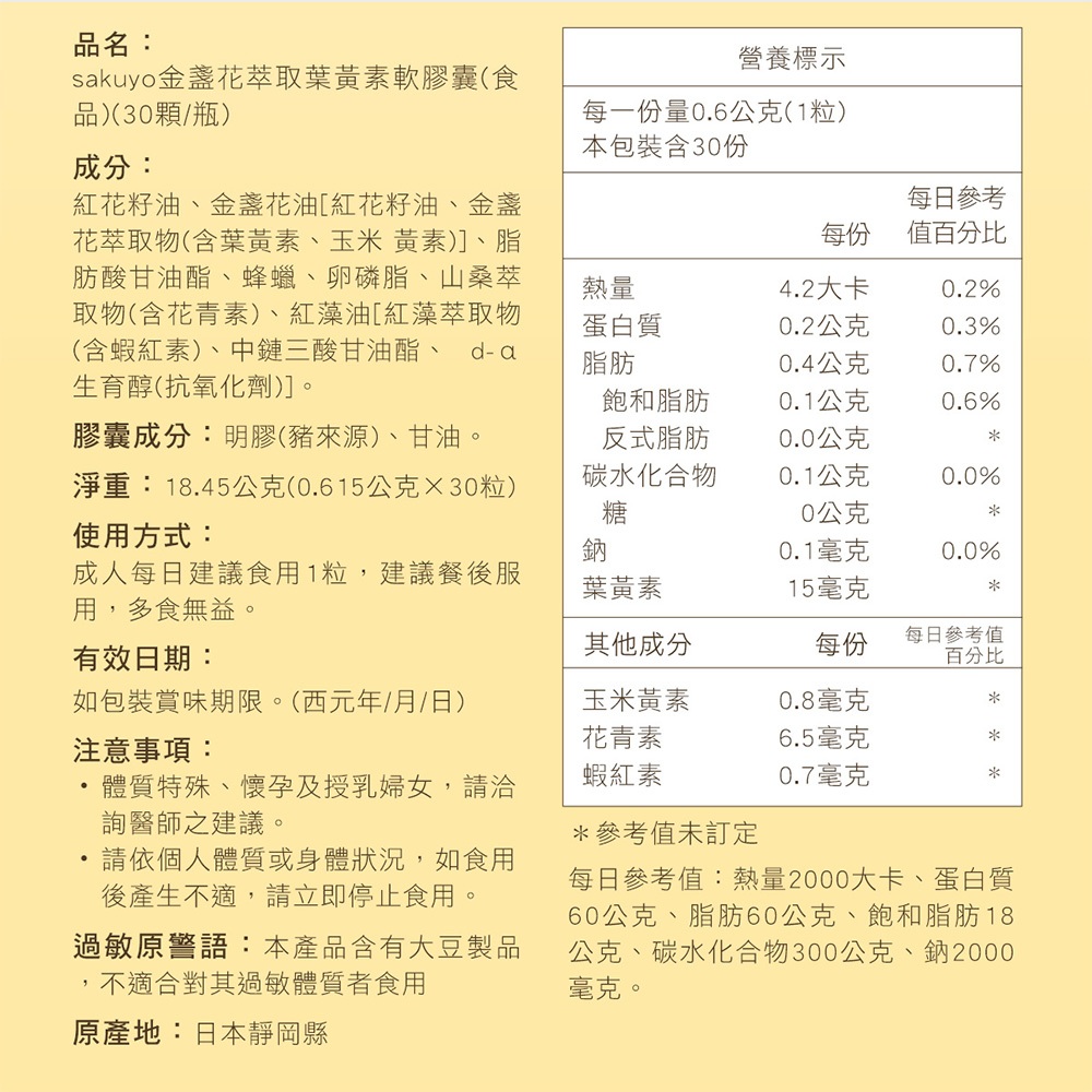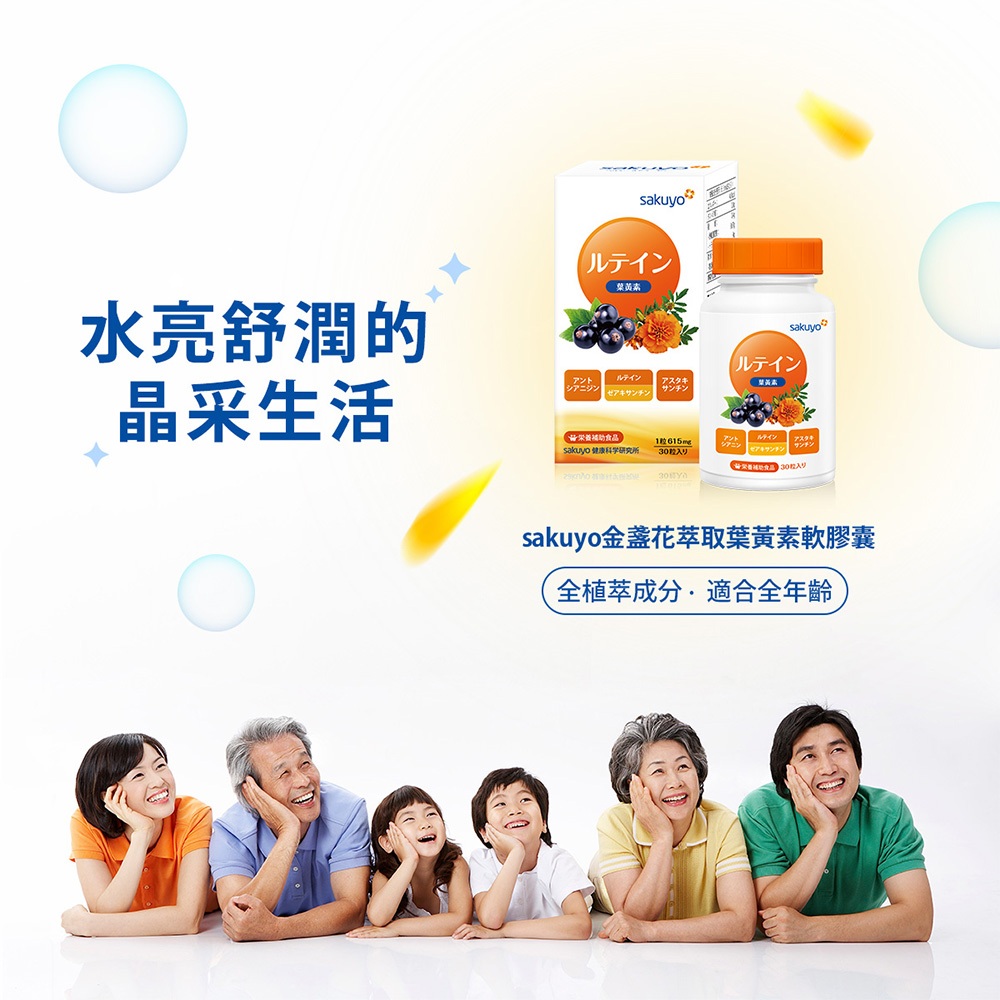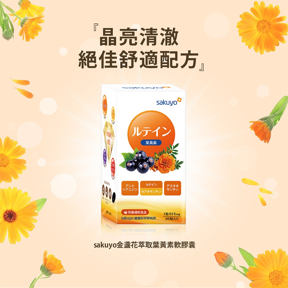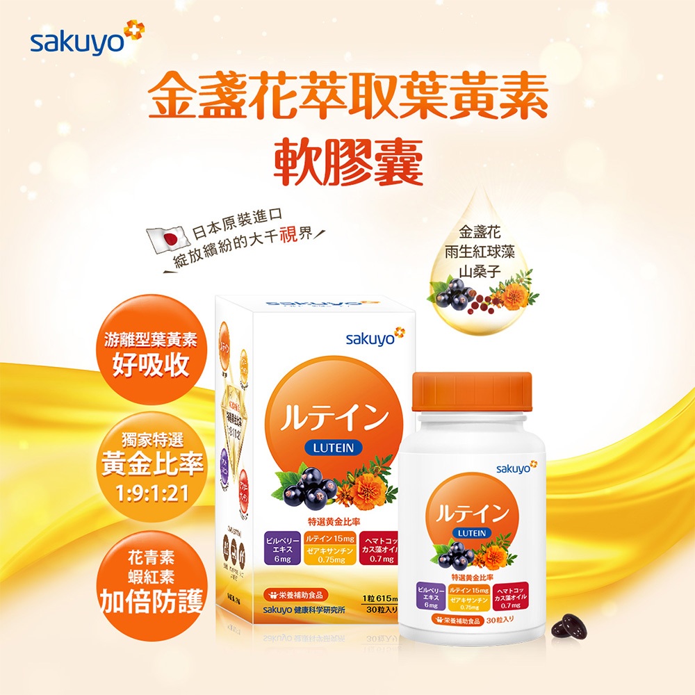 sakuyo 金盞花 萃取 葉黃素 軟膠囊 食品 30顆/瓶 日本製造 山桑子 青花素 紅球藻 蝦紅素神腦生活