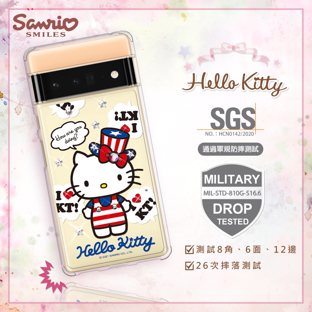 三麗鷗 Kitty Google Pixel 6 Pro 輕薄軍規防摔彩鑽手機殼-凱蒂美國派