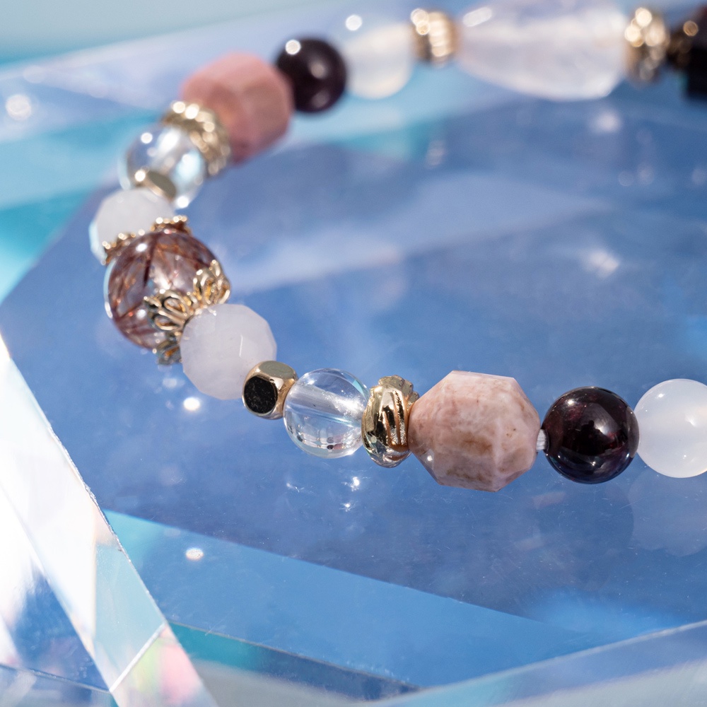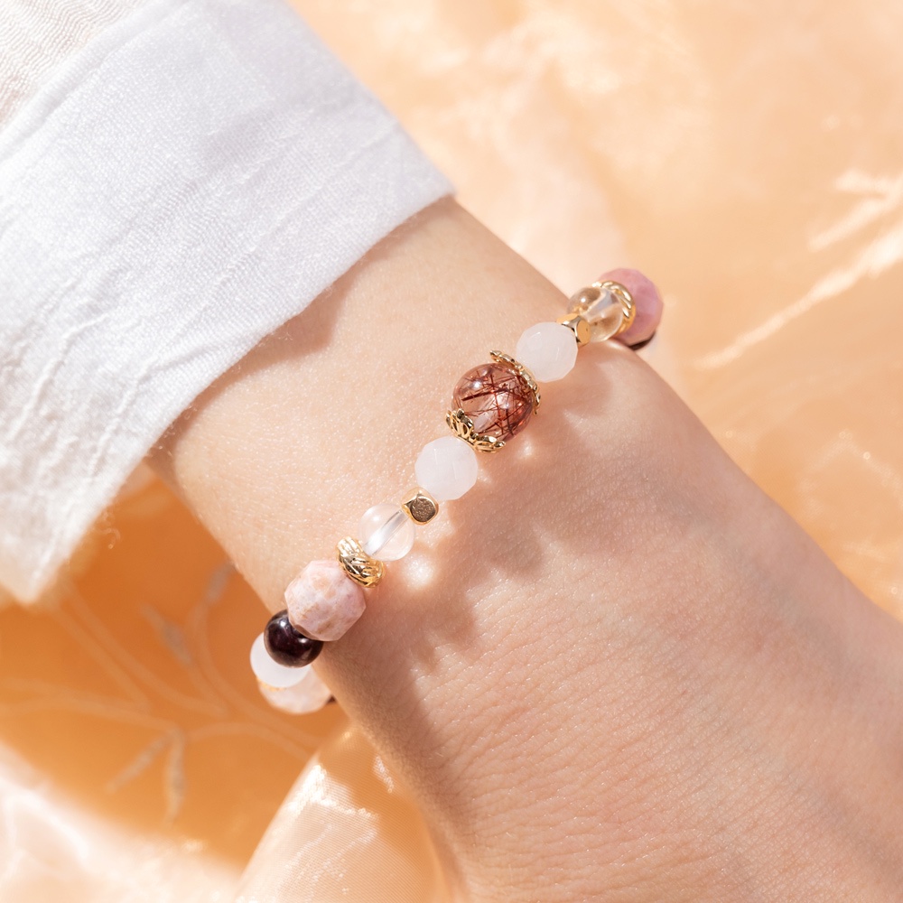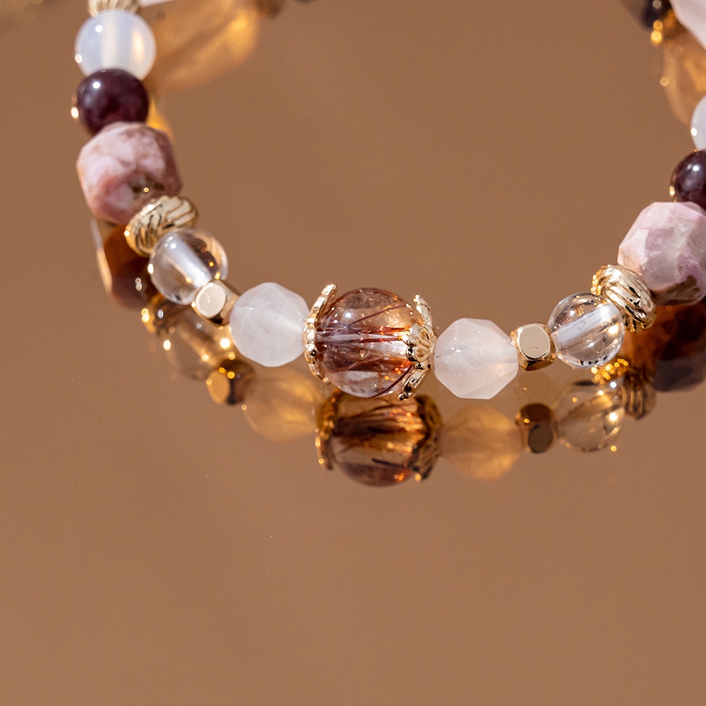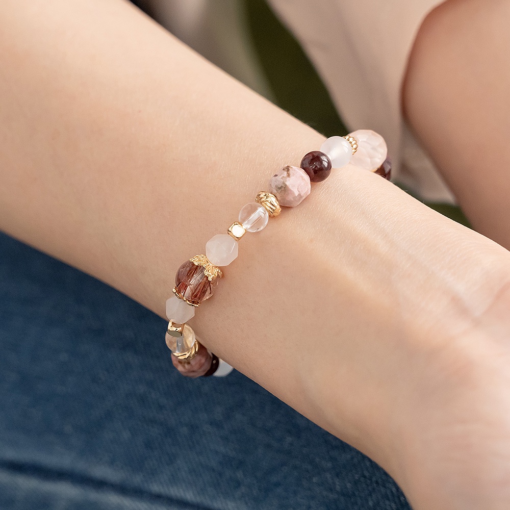 Hermu Accessories 曙光乍現‧紅銅髮絲晶石榴石粉紅水晶天然石彈性手環-E40037