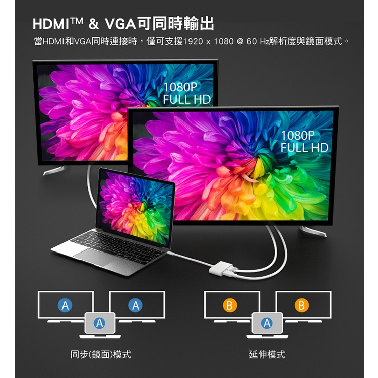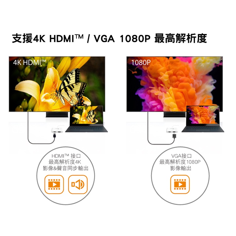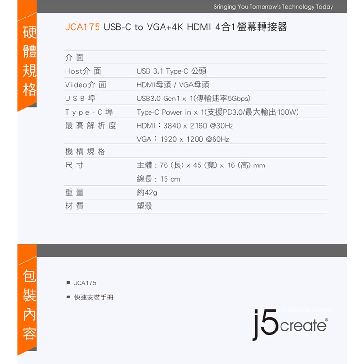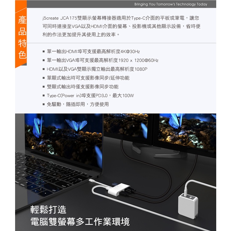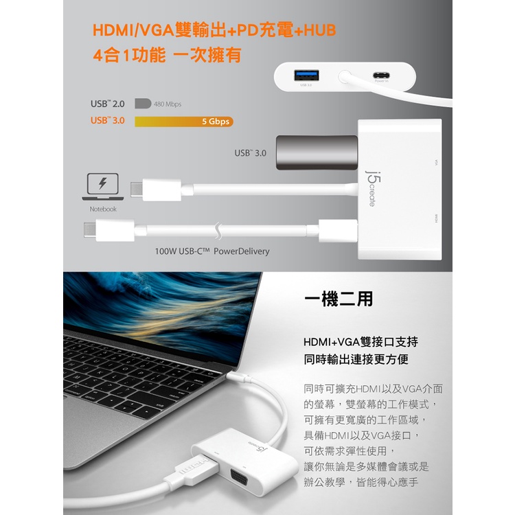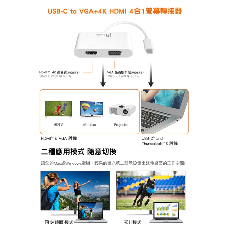 【j5create 凱捷】USB-C to VGA+4K HDMI 4合1螢幕轉接器-JCA175 雙螢幕轉接器
