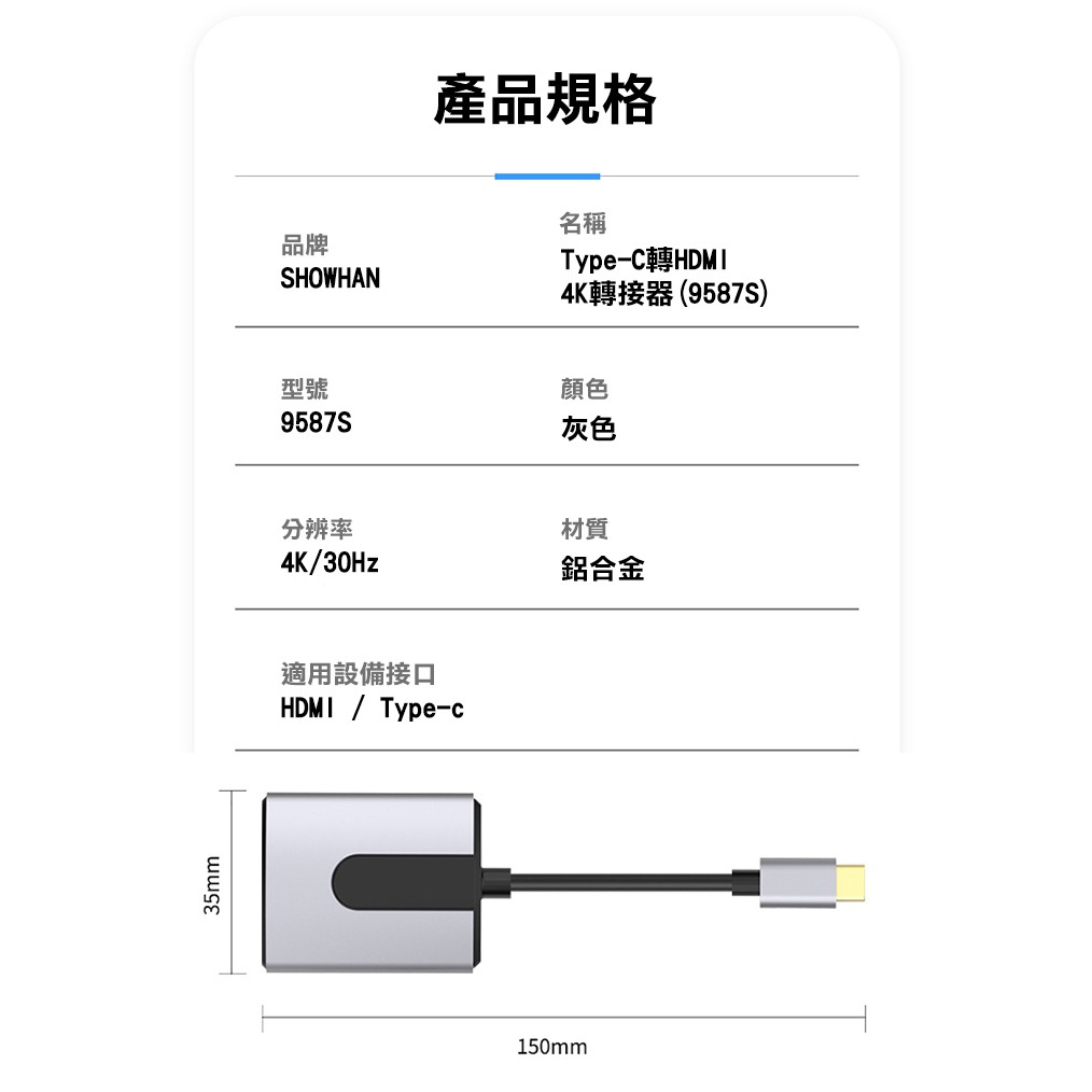 【SHOWHAN】Type-C轉HDMI 4K 影音轉接器(9587S)