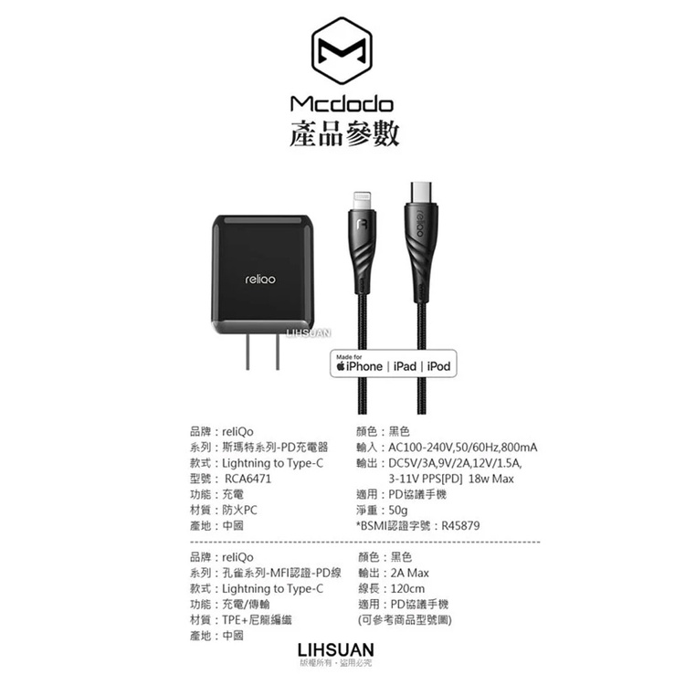 Mcdodo 麥多多 reliQo 蘋果MFi認證PD充電線 Type-C to Lightning+ PD充電器組