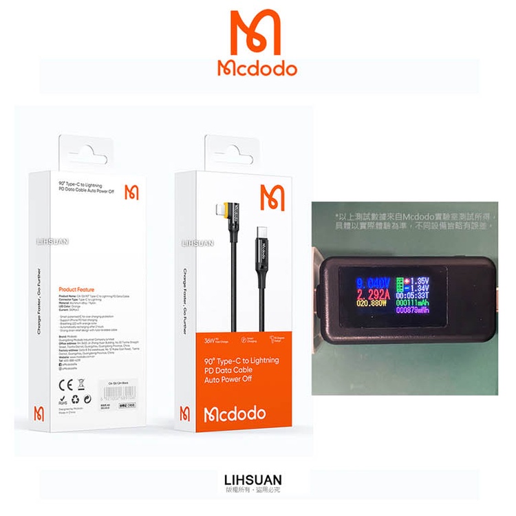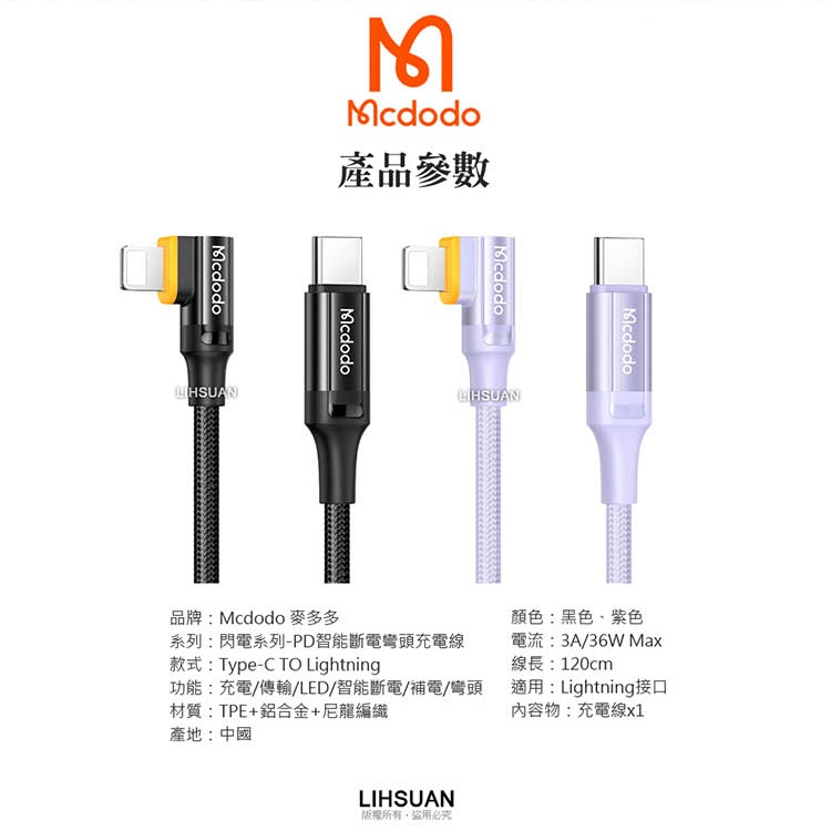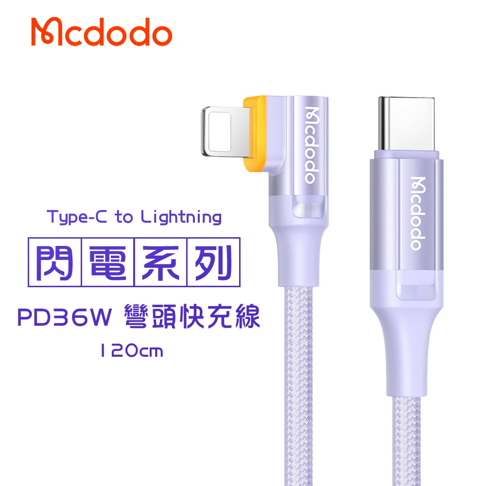 Mcdodo 麥多多 PD 36W 智能斷電充電線 快充 L型 彎頭 閃電 適用 平果 另有二合一智能斷電充電線