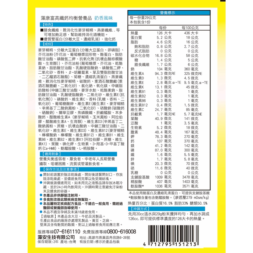 藻康富 高纖鈣均衡營養品 29gx30入 沖泡飲 奶素可食